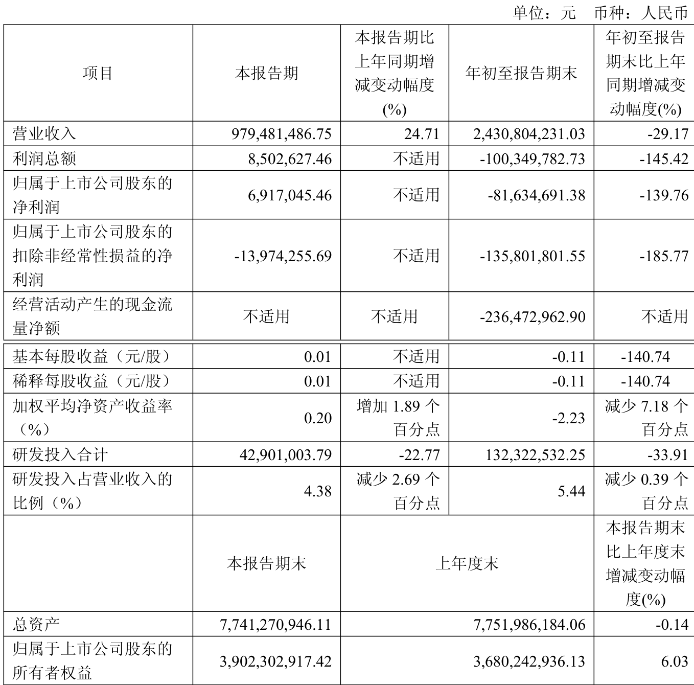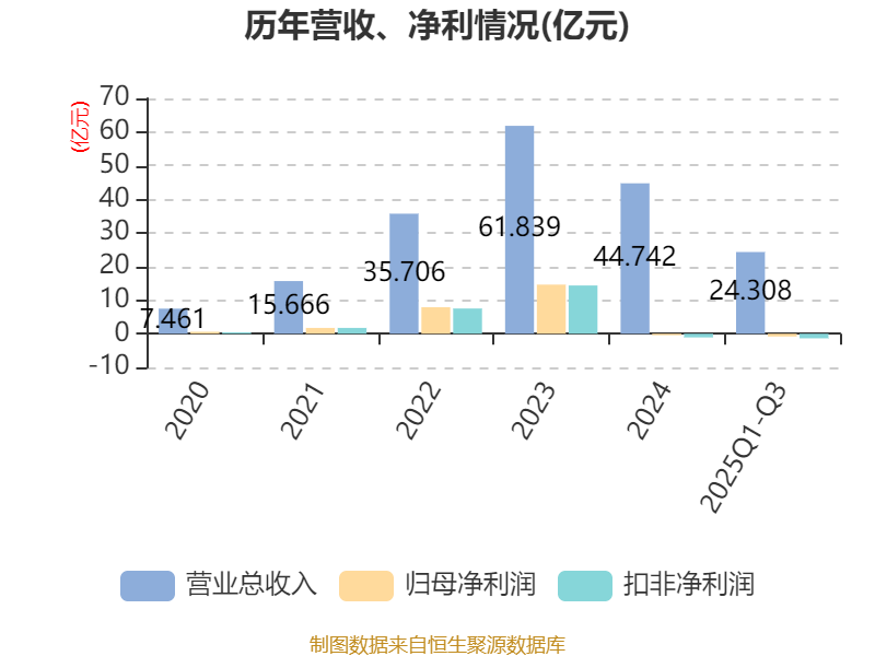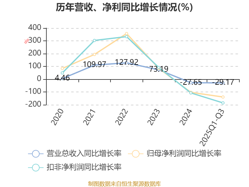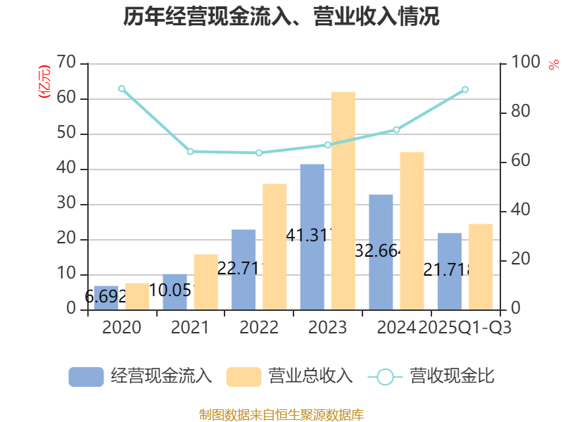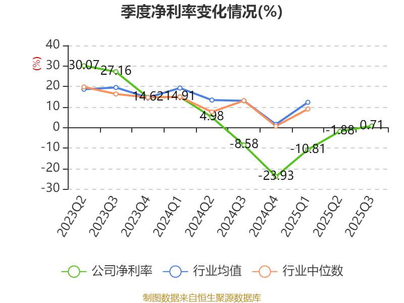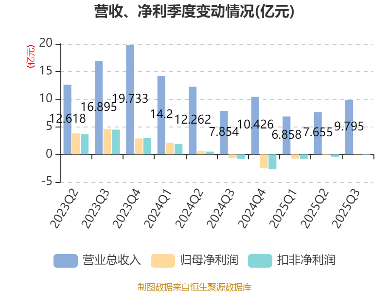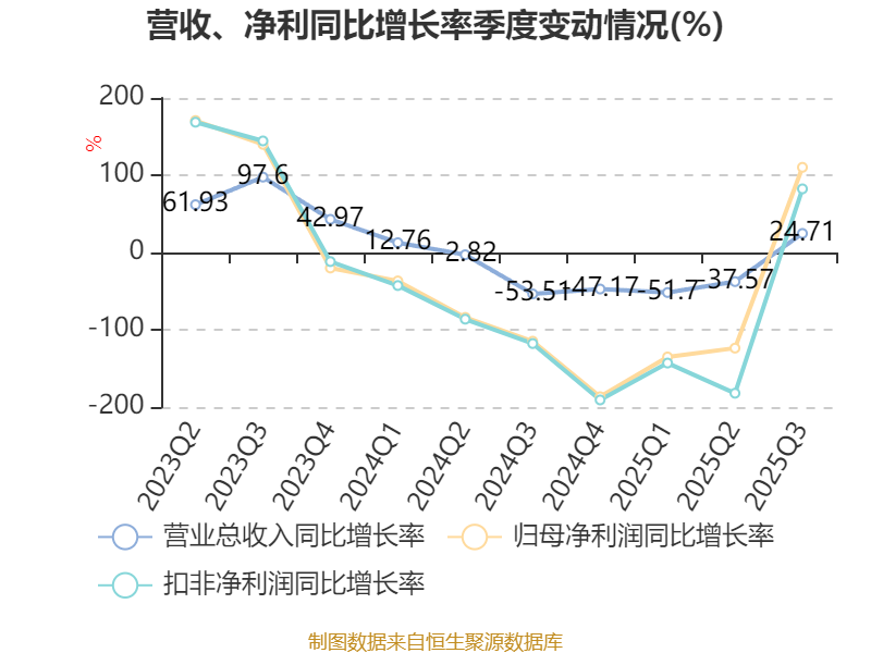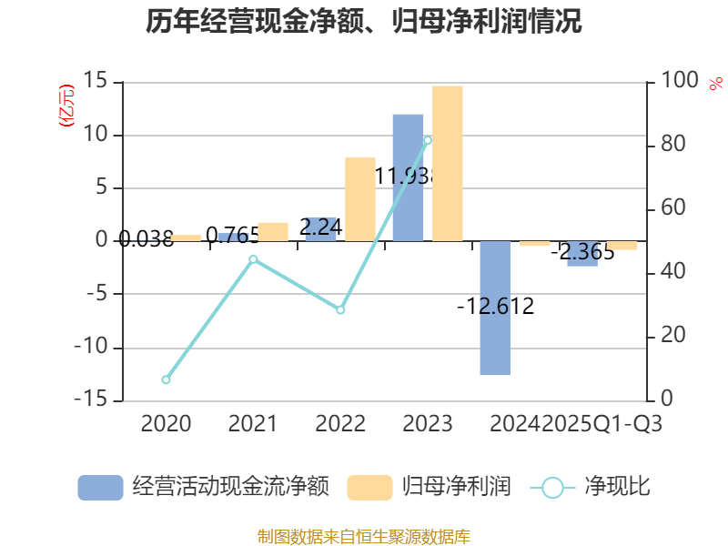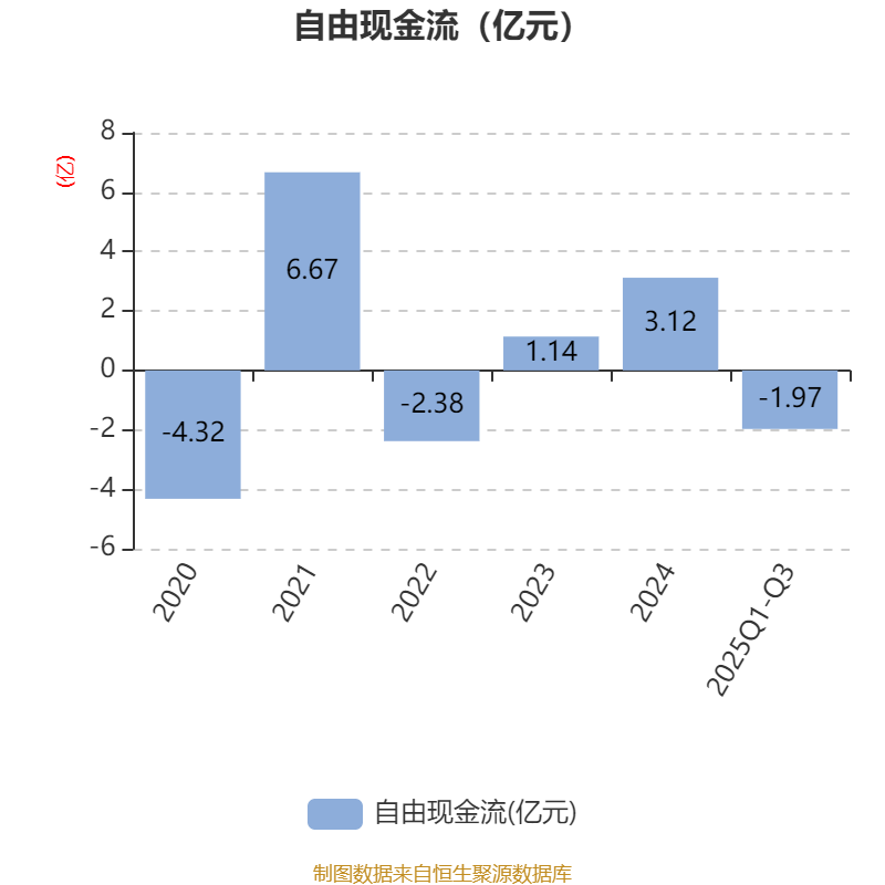 2025年前三季度,公司经营活动现金流净额为-2.36亿元,同比增加6.77亿元;筹资活动现金流净额3.4亿元,同比增加4.32亿元;投资活动现金流净额-1.09亿元,上年同期为12.35亿元。