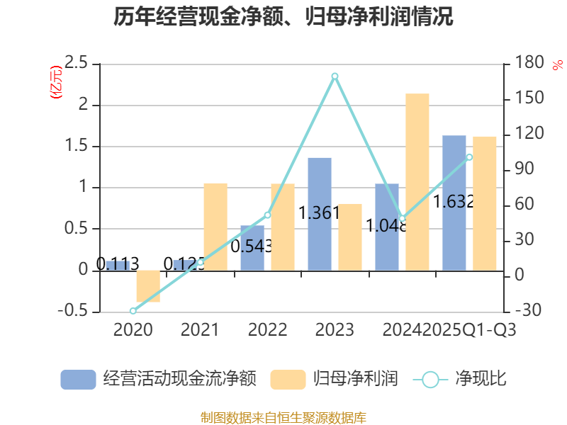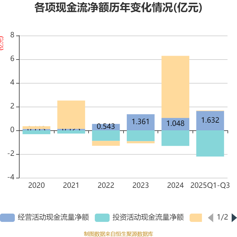 2025年前三季度,公司经营活动现金流净额为1.63亿元,同比增长122.98%;筹资活动现金流净额423.05万元,同比减少80.35万元;投资活动现金流净额-2.21亿元,上年同期为-8980.78万元。