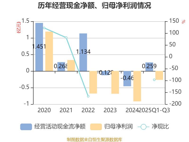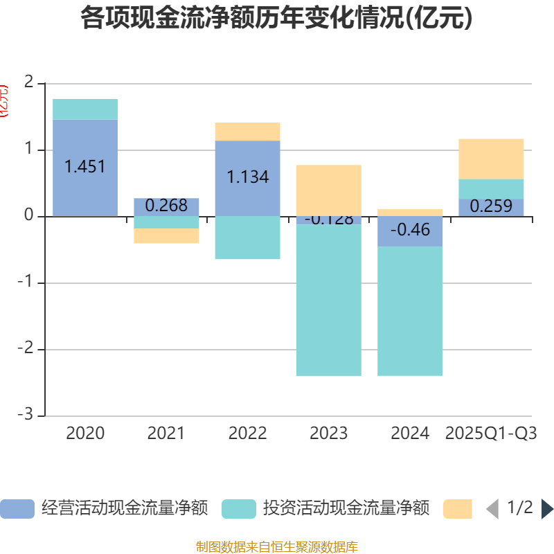 2025年前三季度,公司经营活动现金流净额为2590.43万元,同比增加3093.24万元;筹资活动现金流净额6022.59万元,同比增加4927.31万元;投资活动现金流净额2987.9万元,上年同期为-1.86亿元。