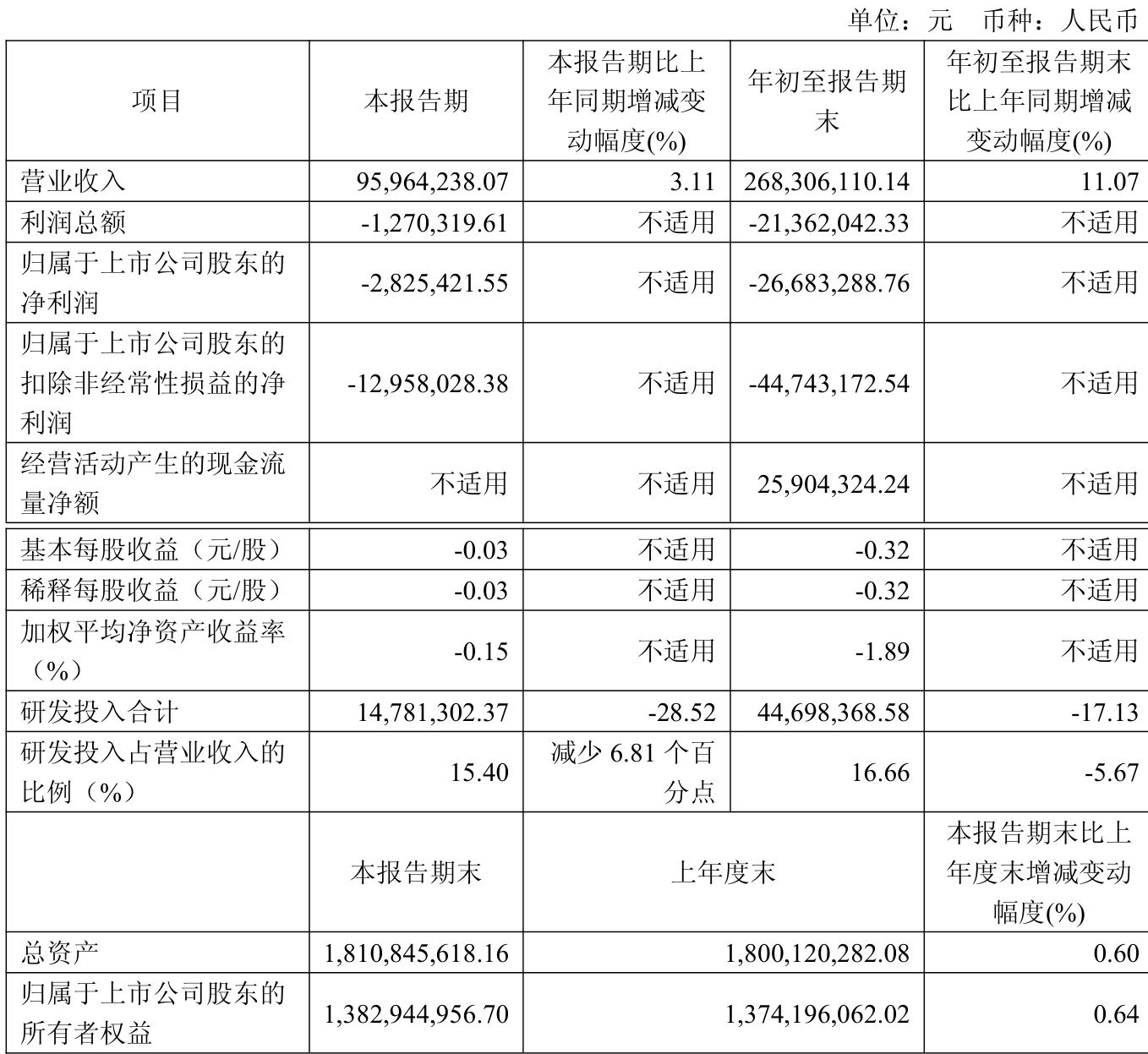 中证智能财讯方邦股份(688020)10月30日披露2025年第三季度报告。前三季度公司实现营业总收入2.68亿元,同比增长11.07%;归母净利润亏损2668.33万元,上年同期亏损3962.67万元;扣非净利润亏损4474.32万元,上年同期亏损5696.93万元;经营活动产生的现金流量净额为2590.43万元,上年同期为-502.81万元;报告期内,方邦股份基本每股收益为-0.32元,加权平均净资产收益率为-1.89%。
