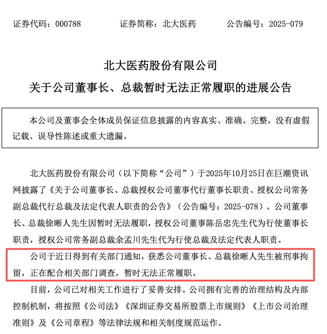 北大医药(000788)10月29日公告,公司于近日得到有关部门通知,获悉公司董事长、总裁徐晰人被刑事拘留,正在配合相关部门调查,暂时无法正常履职。截至本公告披露日,公司控制权未发生变化,公司董事会运作正常,公司财务及生产经营管理情况正常。