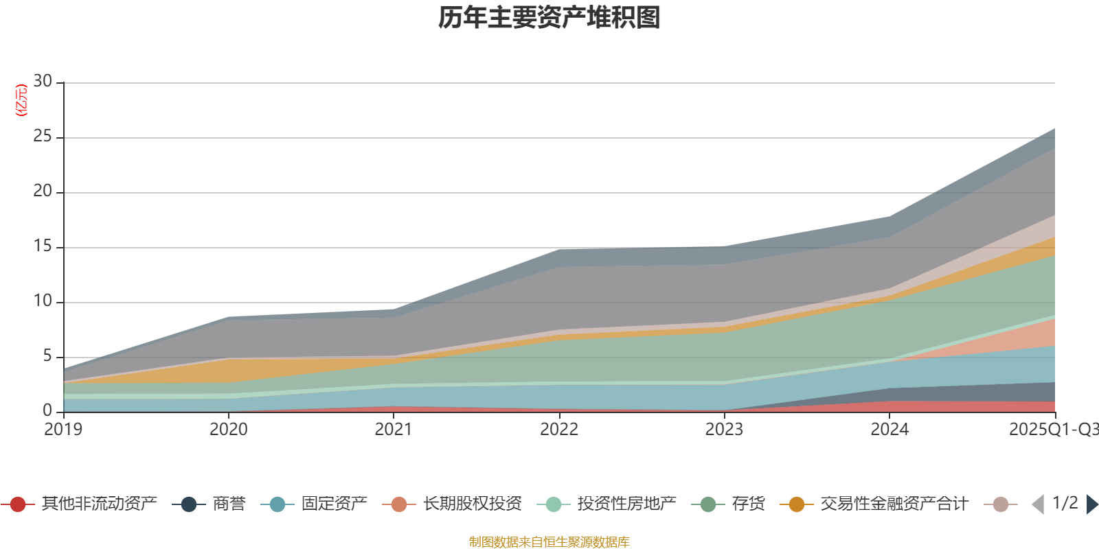 资产重大变化方面,截至2025年三季度末,公司长期股权投资较上年末增加10030.2%,占公司总资产比重上升9.48个百分点;存货较上年末增加2.64%,占公司总资产比重下降8.7个百分点;交易性金融资产合计较上年末增加303.08%,占公司总资产比重上升4.2个百分点;在建工程合计较上年末减少83.22%,占公司总资产比重下降4.2个百分点。