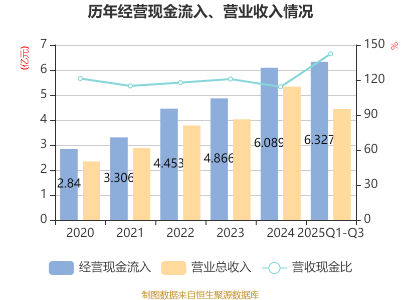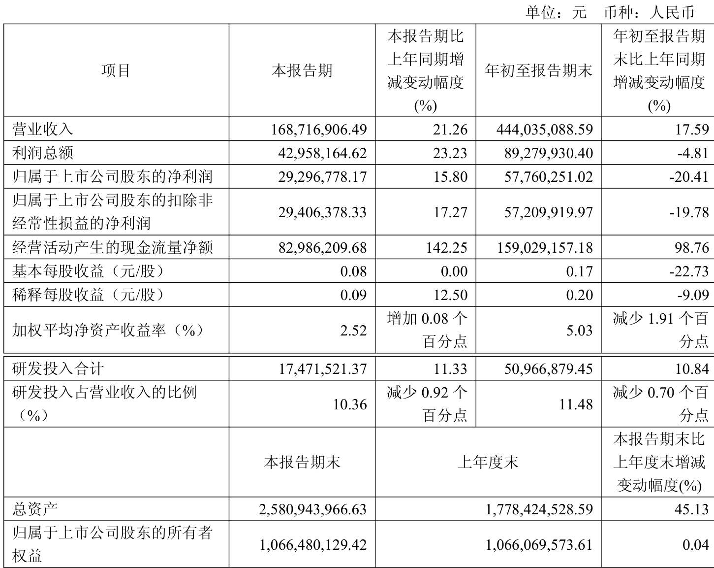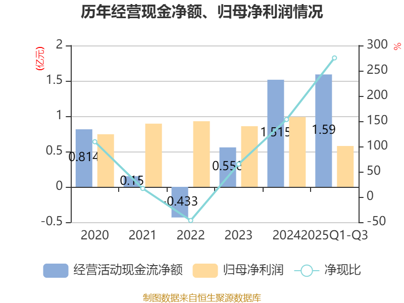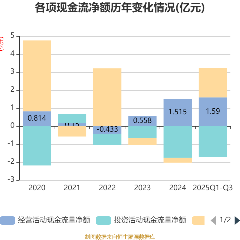 2025年前三季度,公司经营活动现金流净额为1.59亿元,同比增长98.76%;筹资活动现金流净额1.63亿元,同比增加1.73亿元;投资活动现金流净额-1.73亿元,上年同期为-7516.99万元。