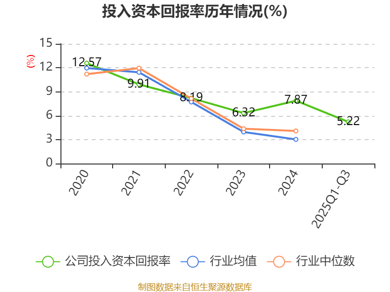 盈利能力方面, 2025年前三季度公司加权平均净资产收益率为5.03%,同比下降1.91个百分点。公司2025年前三季度投入资本回报率为5.22%,较上年同期下降0.66个百分点。