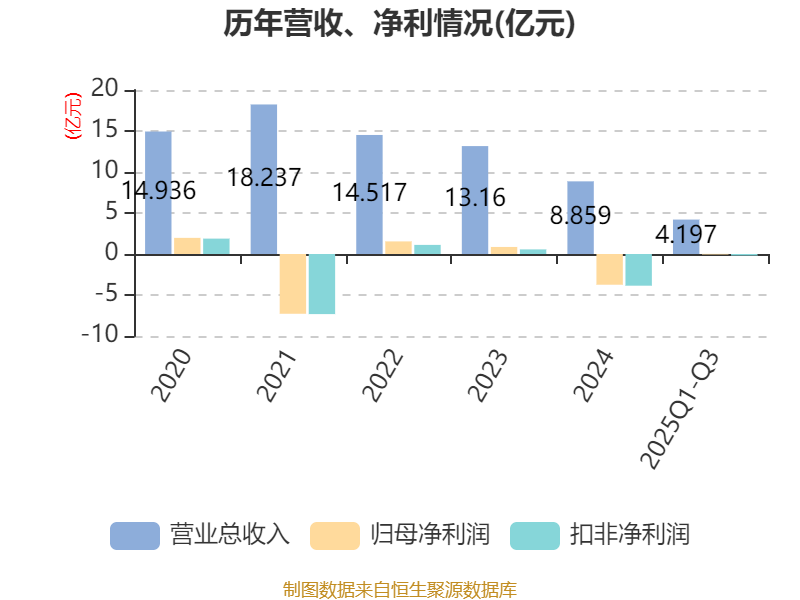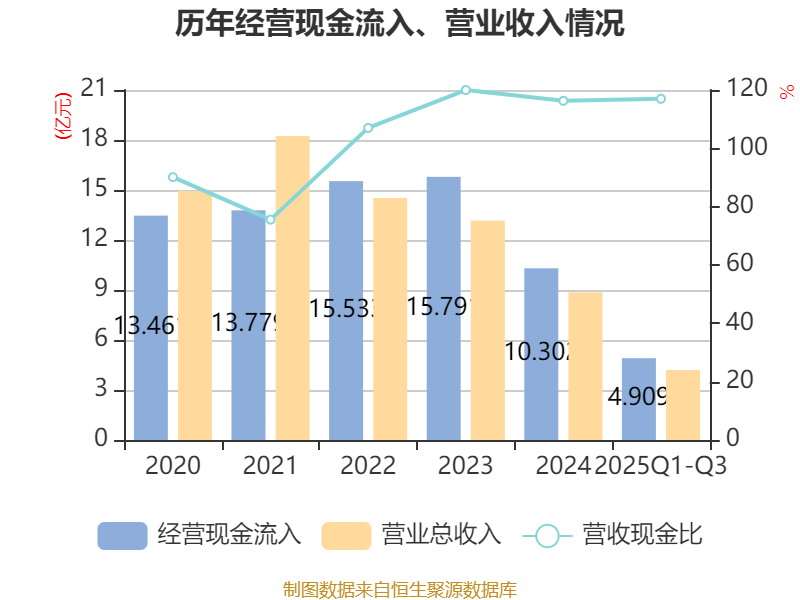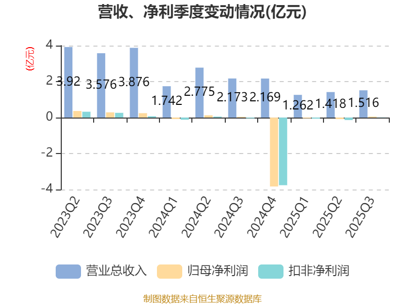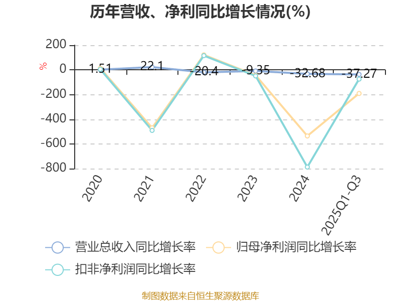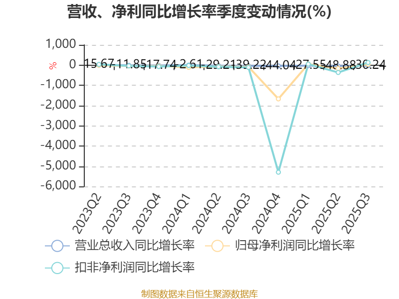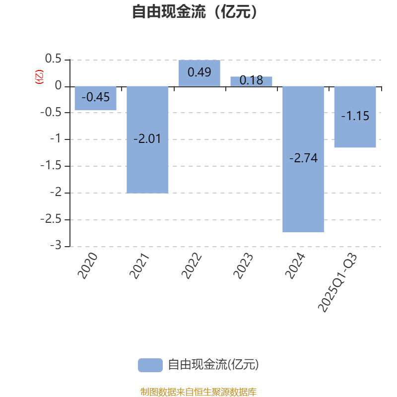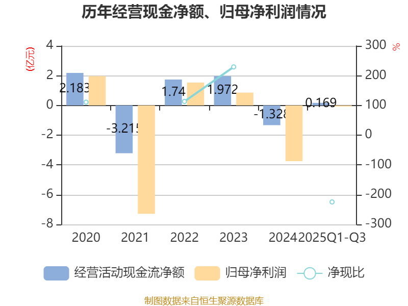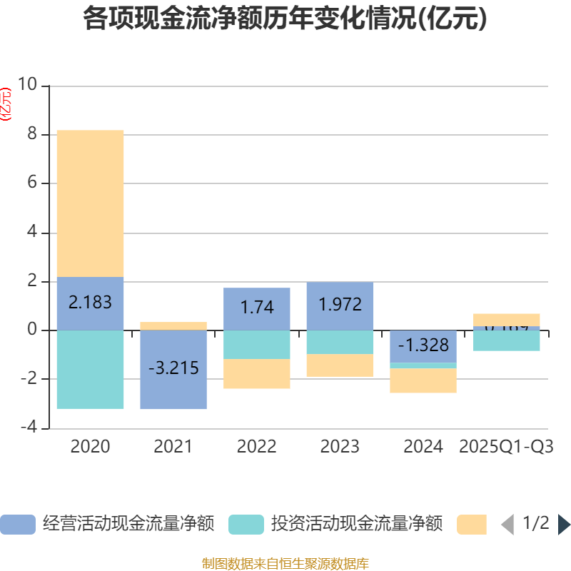 2025年前三季度,公司经营活动现金流净额为1689.2万元,同比增加8023.11万元;筹资活动现金流净额5105.6万元,同比增加2.12亿元;投资活动现金流净额-8395.83万元,上年同期为-229.12万元。
