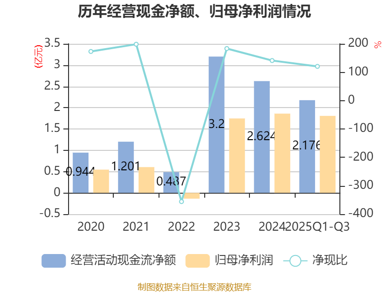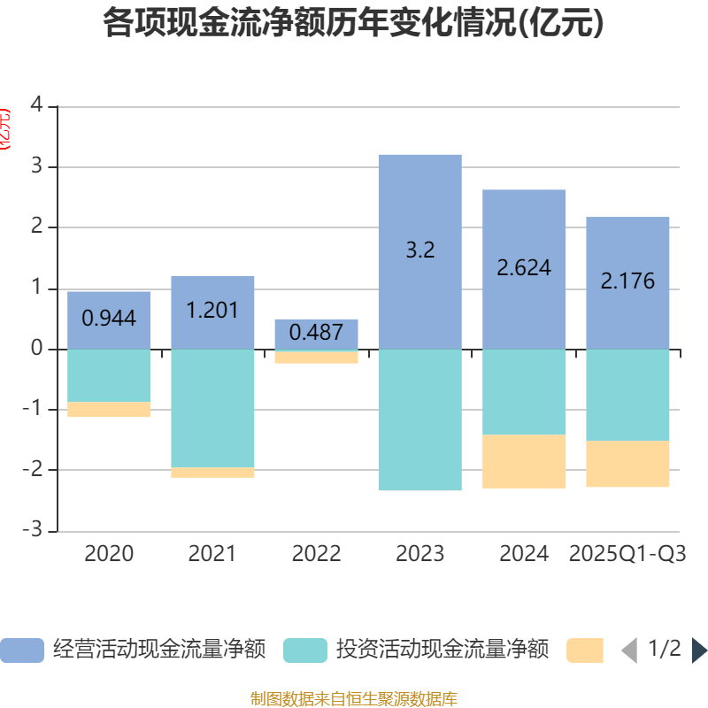 2025年前三季度,公司经营活动现金流净额为2.18亿元,同比增长33.94%;筹资活动现金流净额-7587.63万元,同比增加1228.62万元;投资活动现金流净额-1.52亿元,上年同期为-176.63万元。