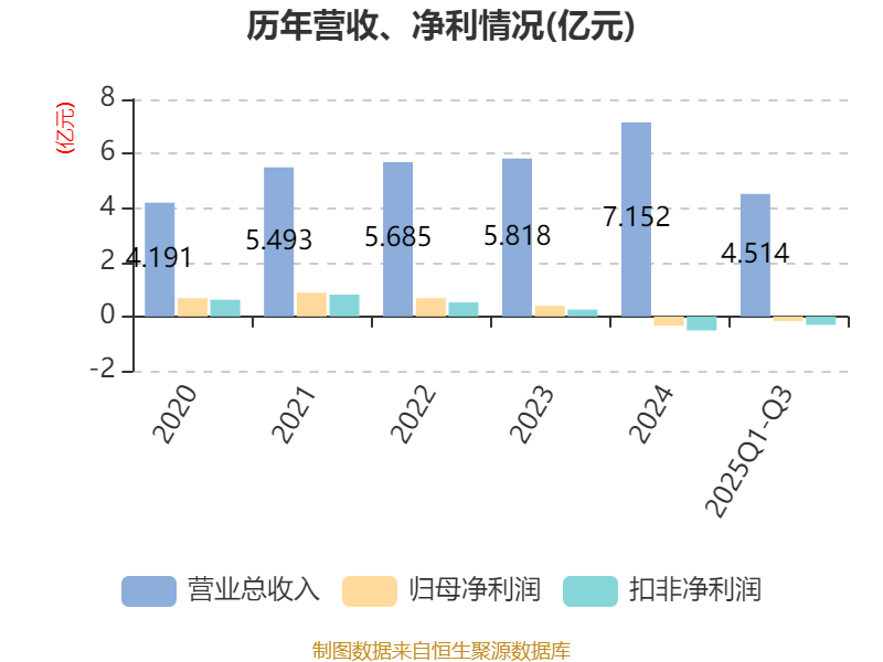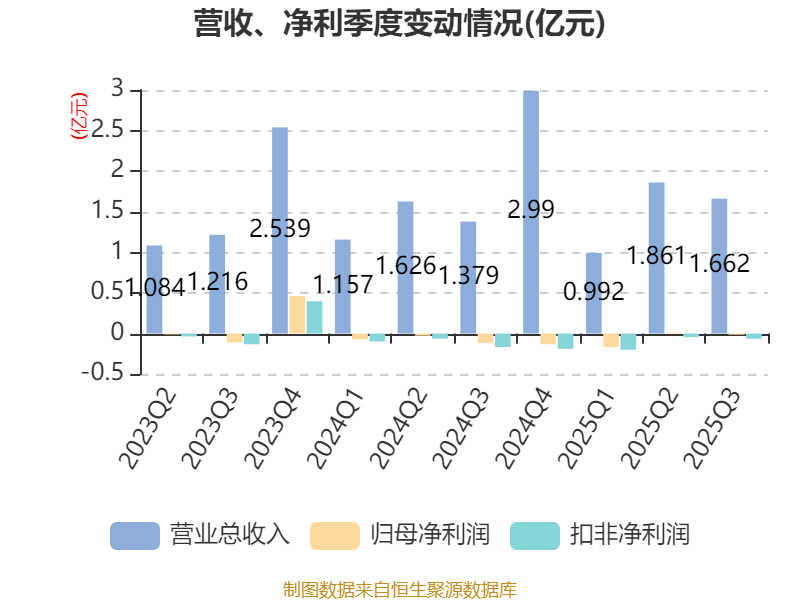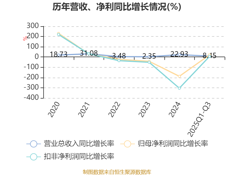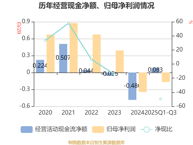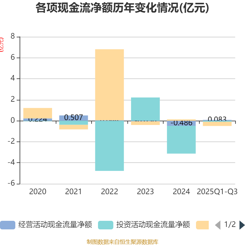 2025年前三季度,公司经营活动现金流净额为833.83万元,同比增加8824.78万元;筹资活动现金流净额-3975.03万元,同比减少5595.11万元;投资活动现金流净额-1003.75万元,上年同期为-2.3亿元。