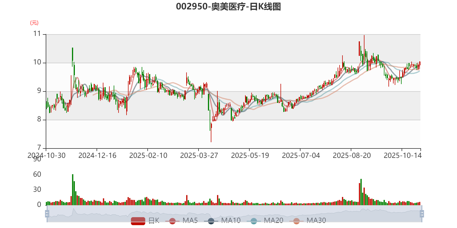 中证智能财讯奥美医疗(002950)10月30日披露2025年第三季度报告。前三季度公司实现营业总收入25.97亿元,同比增长5.98%;归母净利润3.49亿元,同比增长31.54%;扣非净利润3.09亿元,同比增长26.46%;经营活动产生的现金流量净额为5.51亿元,同比增长6.70%;报告期内,奥美医疗基本每股收益为0.5519元,加权平均净资产收益率为9.72%。
