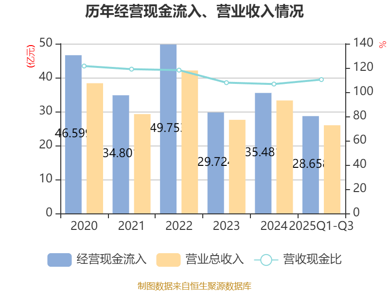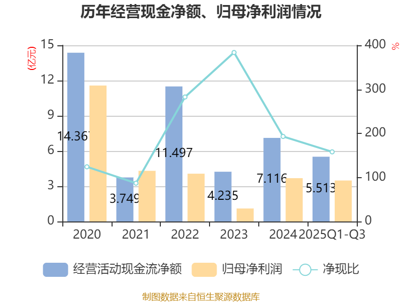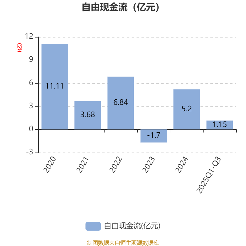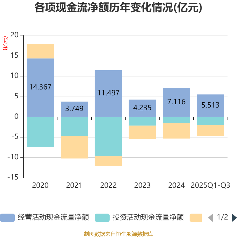 2025年前三季度,公司经营活动现金流净额为5.51亿元,同比增长6.7%;筹资活动现金流净额-2.63亿元,同比减少6222.52万元;投资活动现金流净额-2.1亿元,上年同期为-9688.58万元。