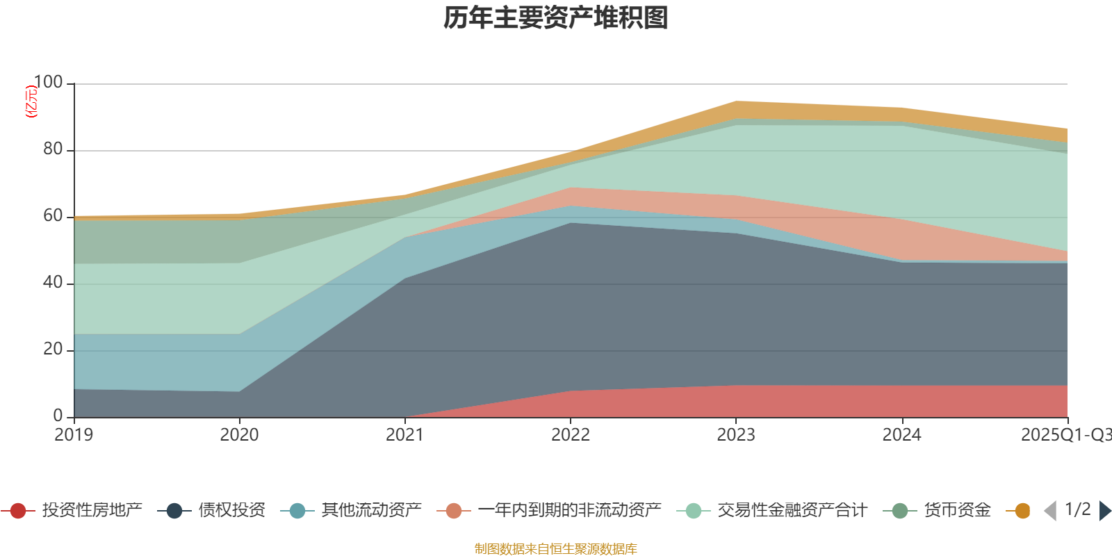 资产重大变化方面,截至2025年三季度末,公司一年内到期的非流动资产较上年末减少76.31%,占公司总资产比重下降9.85个百分点;交易性金融资产合计较上年末增加4.09%,占公司总资产比重上升3.54个百分点;债权投资较上年末减少0.63%,占公司总资产比重上升2.64个百分点;货币资金较上年末增加166.37%,占公司总资产比重上升2.56个百分点。