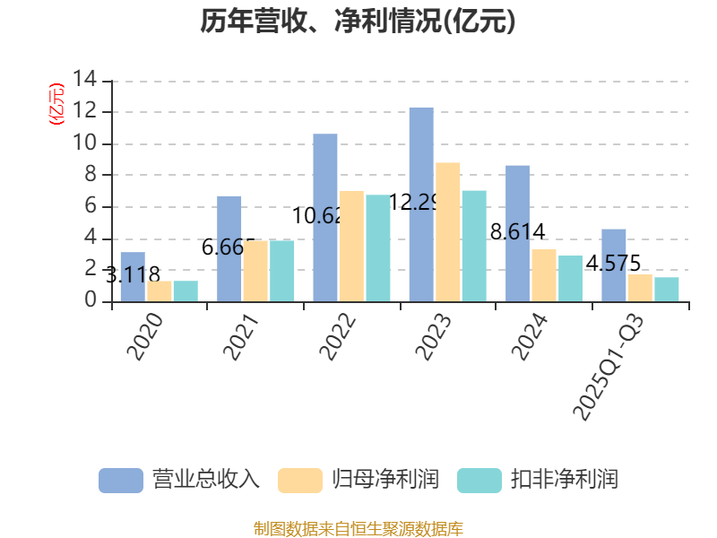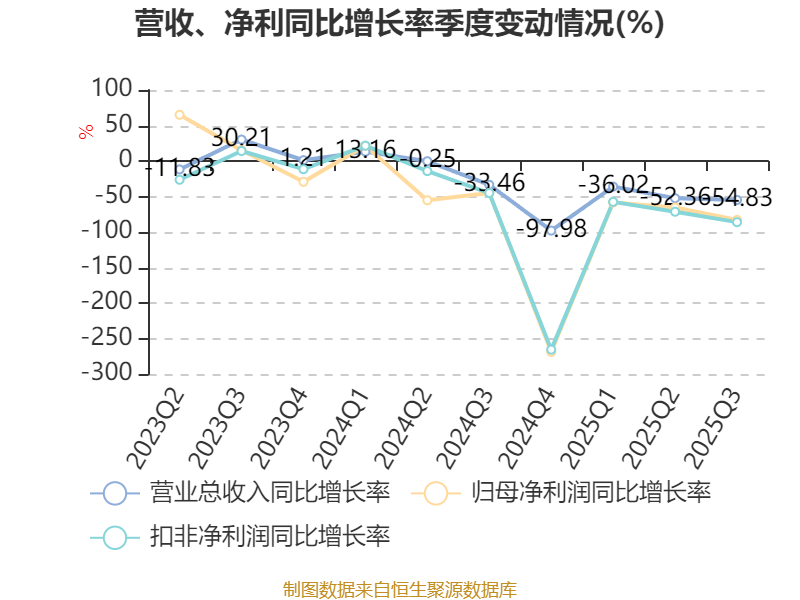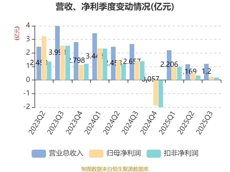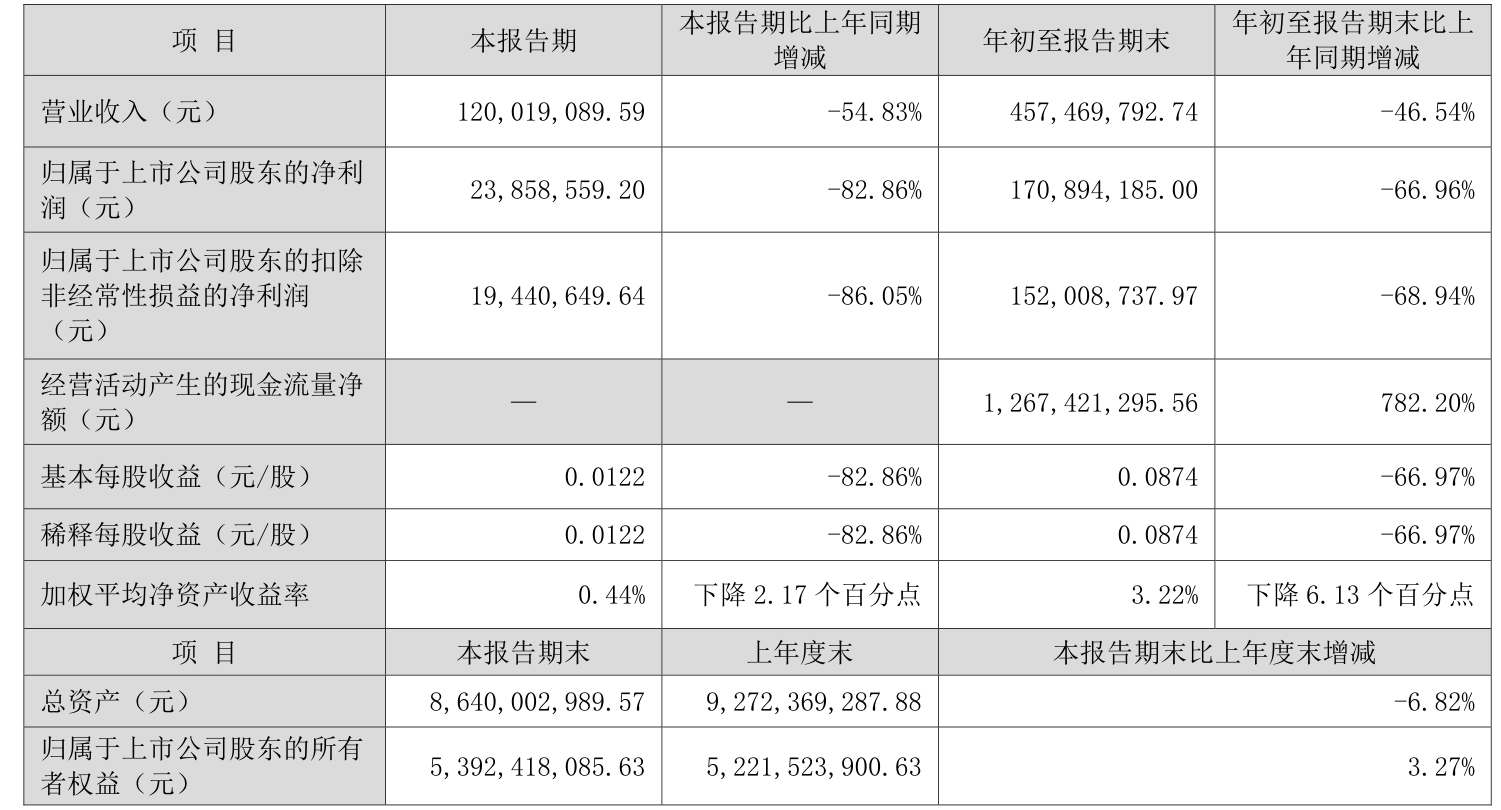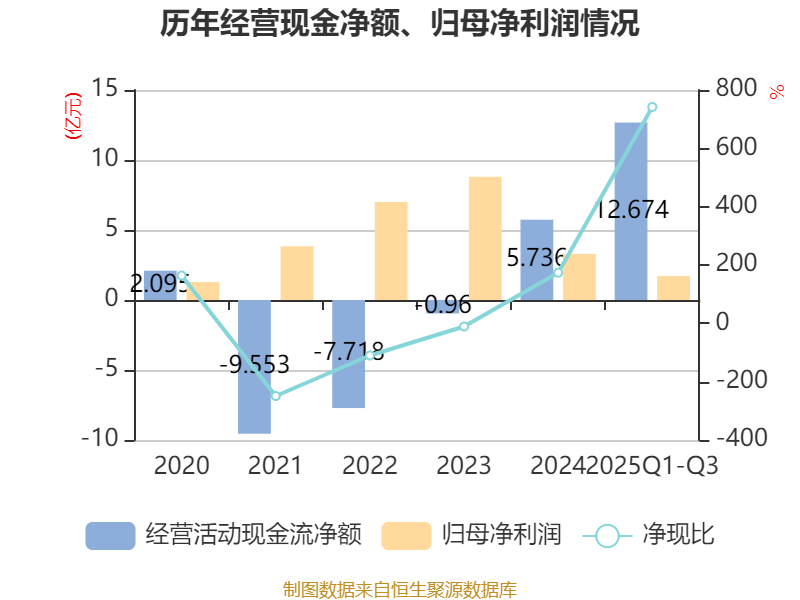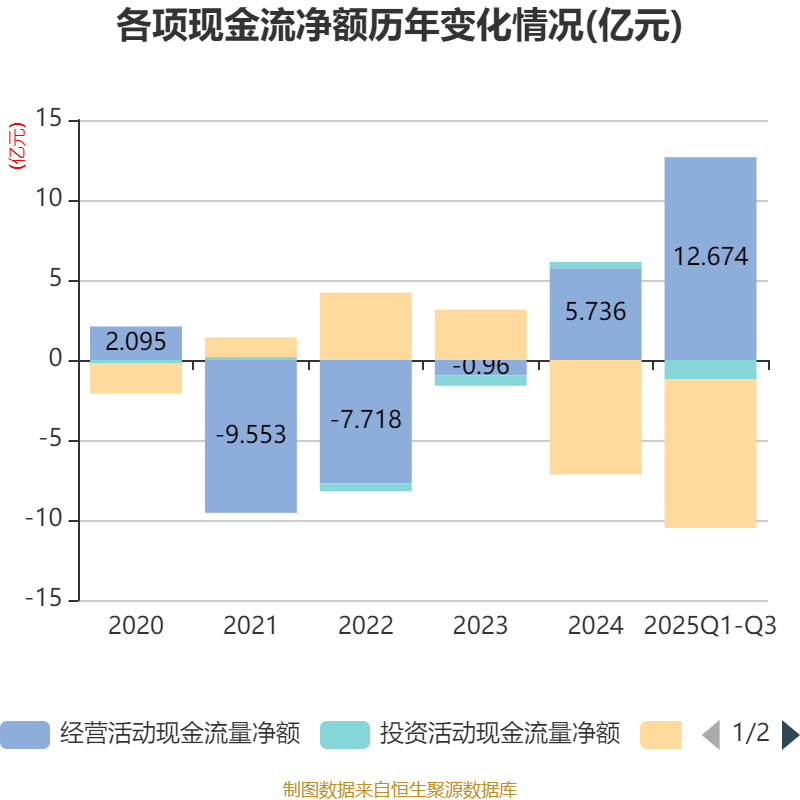 2025年前三季度,公司经营活动现金流净额为12.67亿元,同比增长782.2%;筹资活动现金流净额-9.3亿元,同比减少6.1亿元;投资活动现金流净额-1.2亿元,上年同期为2632.73万元。