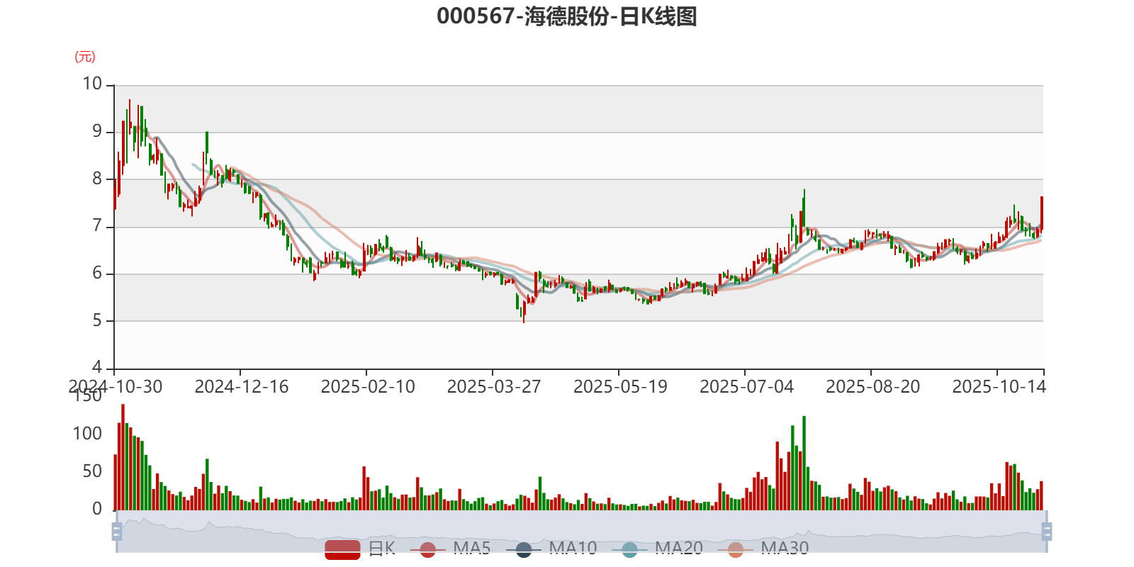 中证智能财讯海德股份(000567)10月30日披露2025年第三季度报告。前三季度公司实现营业总收入4.57亿元,同比下降46.54%;归母净利润1.71亿元,同比下降66.96%;扣非净利润1.52亿元,同比下降68.94%;经营活动产生的现金流量净额为12.67亿元,同比增长782.20%;报告期内,海德股份基本每股收益为0.0874元,加权平均净资产收益率为3.22%。