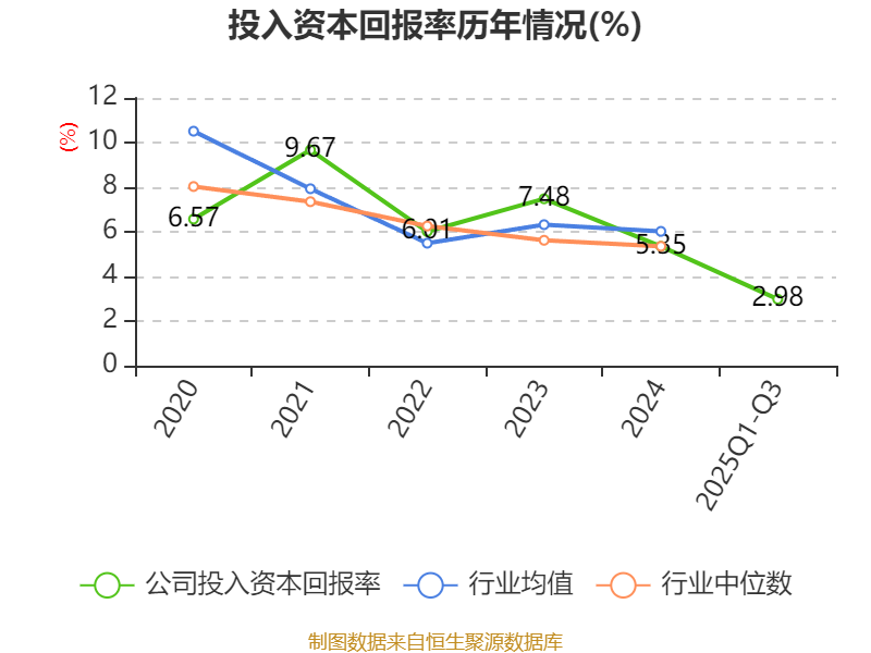 盈利能力方面, 2025年前三季度公司加权平均净资产收益率为6.03%,同比下降2.21个百分点。公司2025年前三季度投入资本回报率为2.98%,较上年同期下降1.35个百分点。
