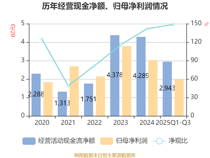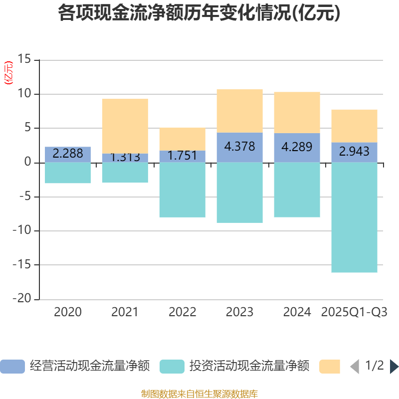 2025年前三季度,公司经营活动现金流净额为2.94亿元,同比下降5.21%;筹资活动现金流净额4.78亿元,同比增加1.85亿元;投资活动现金流净额-16.09亿元,上年同期为-5.62亿元。