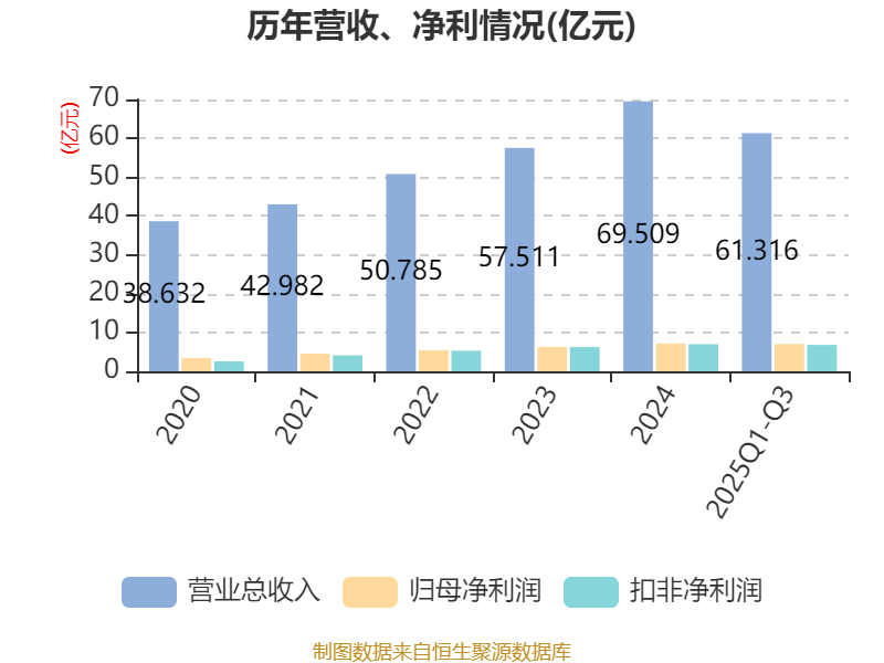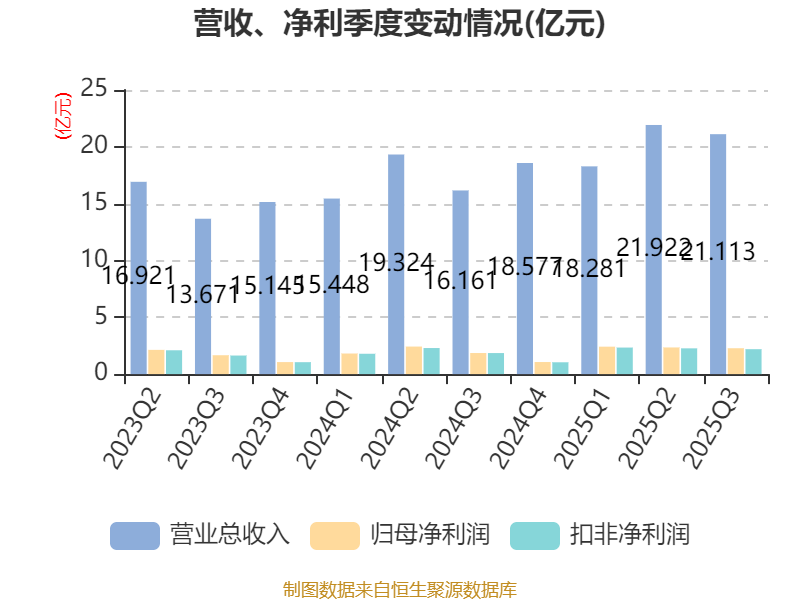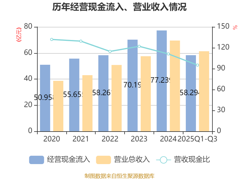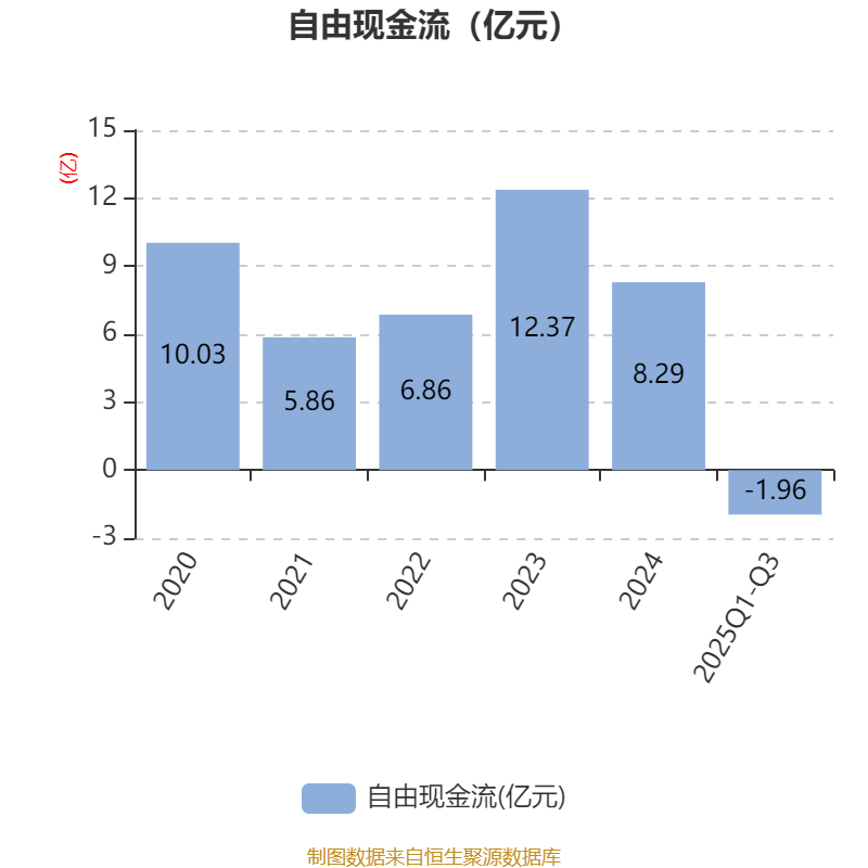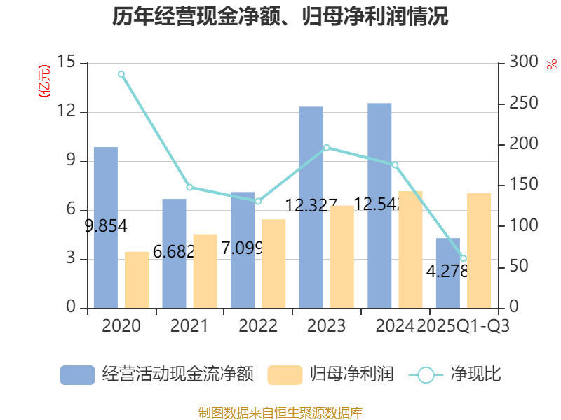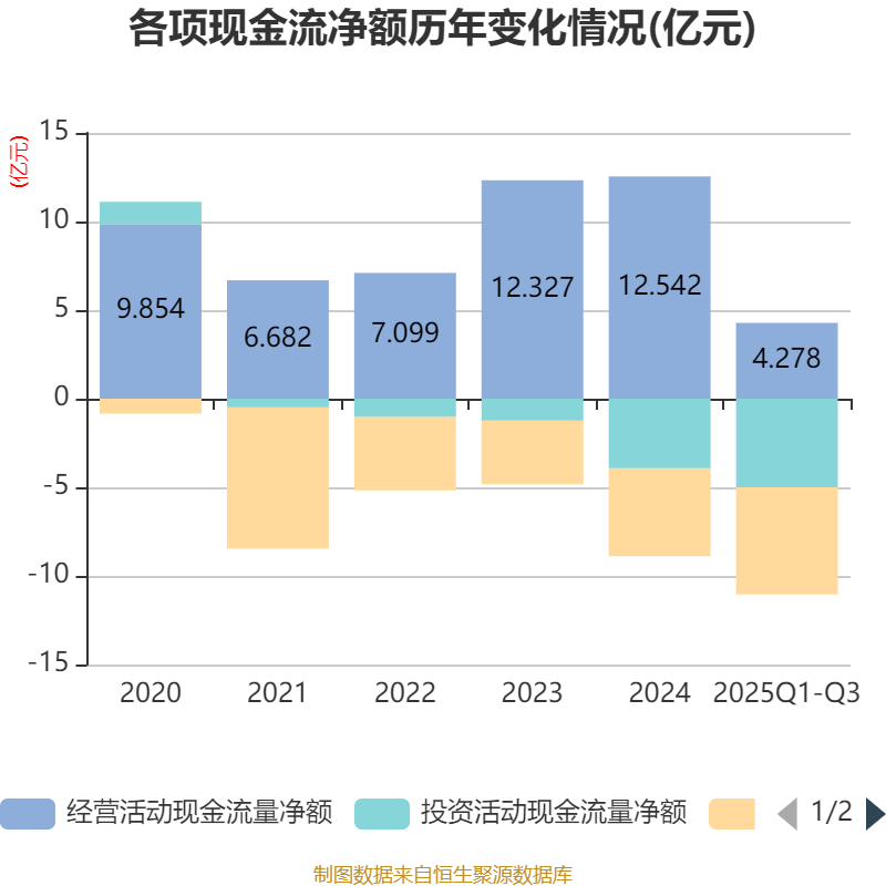 2025年前三季度,公司经营活动现金流净额为4.28亿元,同比下降25.44%;筹资活动现金流净额-6.04亿元,同比减少1.11亿元;投资活动现金流净额-5亿元,上年同期为-1.13亿元。