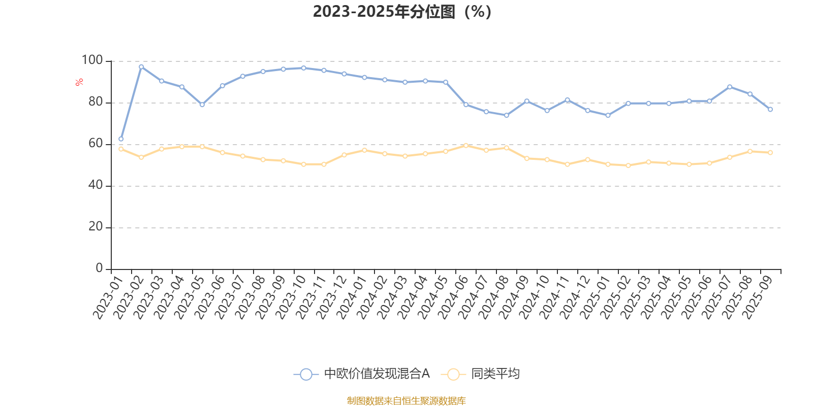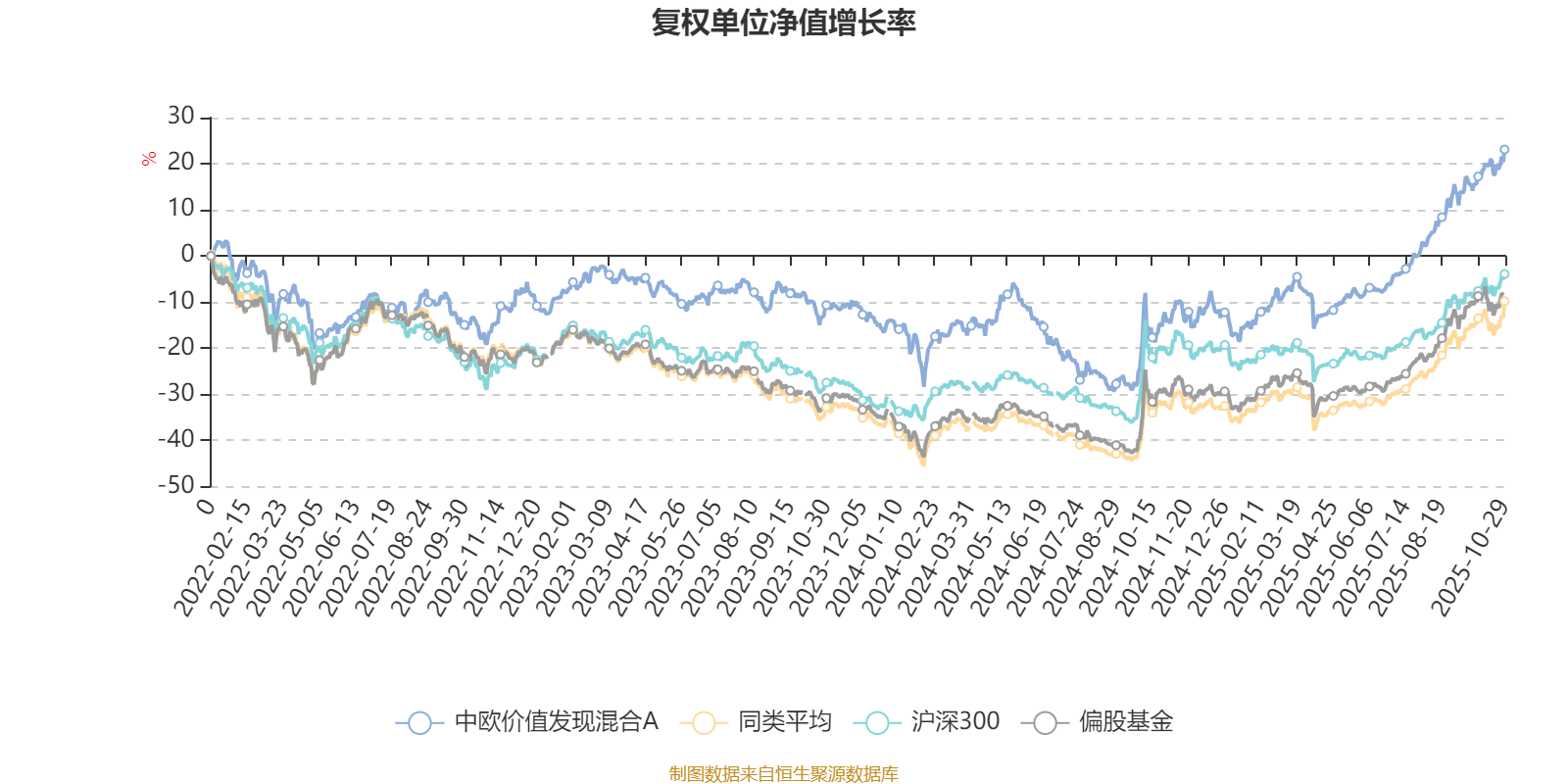 截至10月29日,中欧价值发现混合A近三个月复权单位净值增长率为21.03%,位于同类可比基金55/185;近半年复权单位净值增长率为37.31%,位于同类可比基金62/185;近一年复权单位净值增长率为42.97%,位于同类可比基金46/181;近三年复权单位净值增长率为51.34%,位于同类可比基金27/175。