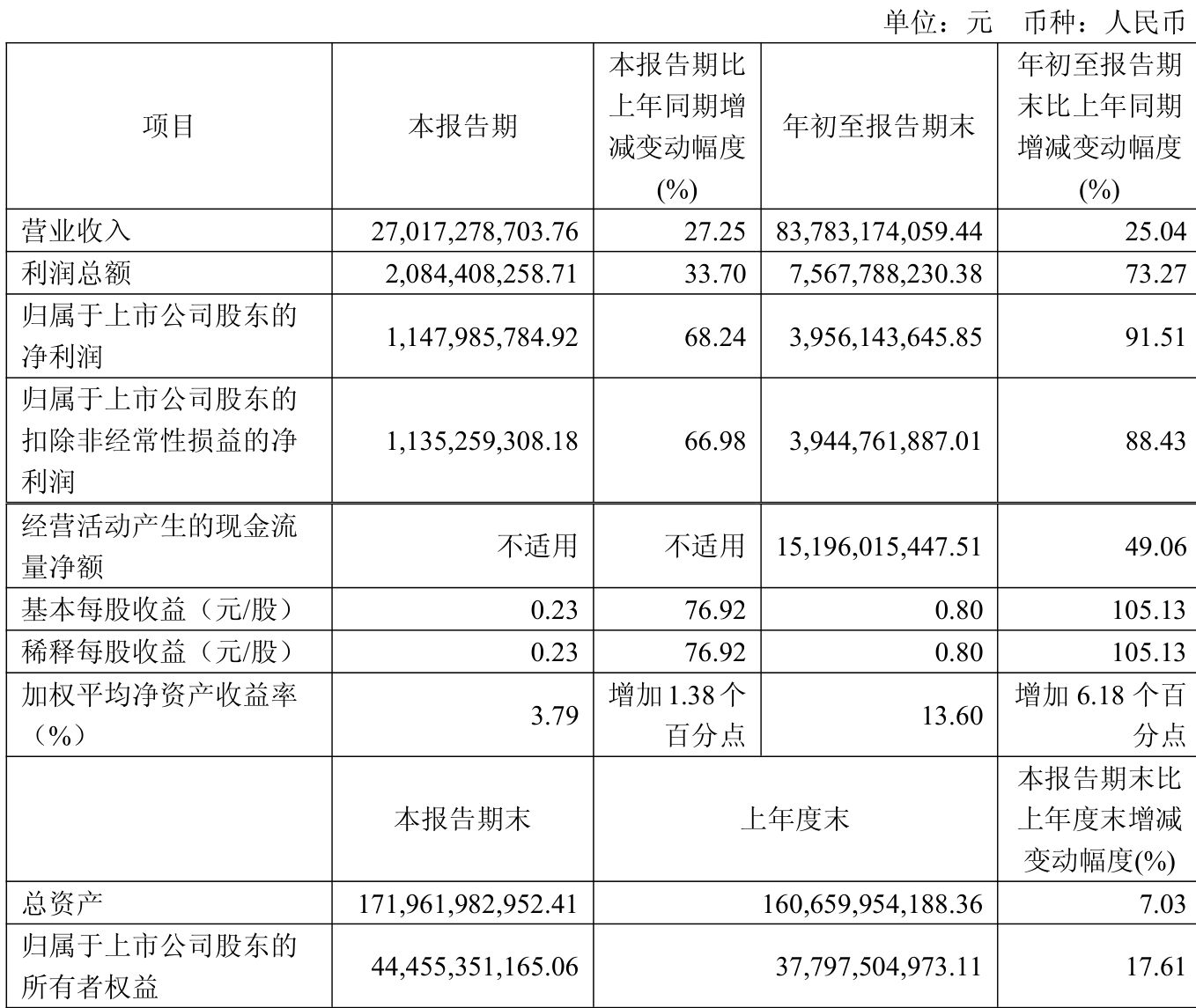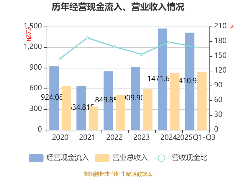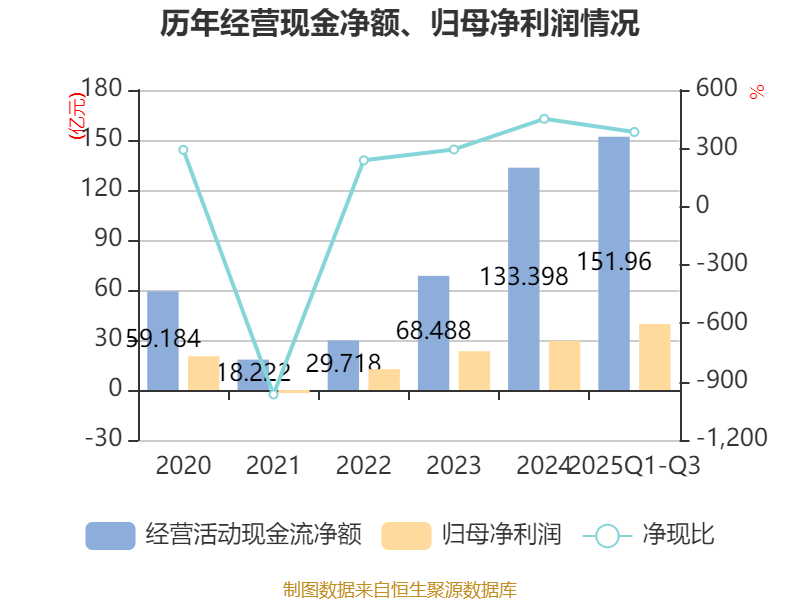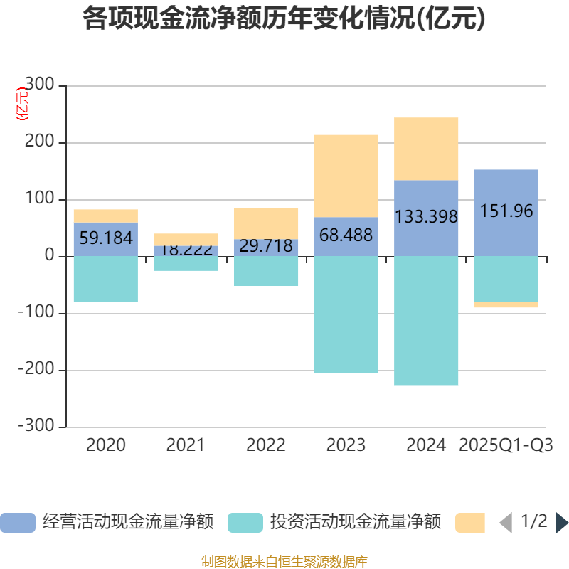 2025年前三季度,公司经营活动现金流净额为151.96亿元,同比增长49.06%;筹资活动现金流净额-9.91亿元,同比减少102亿元;投资活动现金流净额-80.36亿元,上年同期为-192.73亿元。