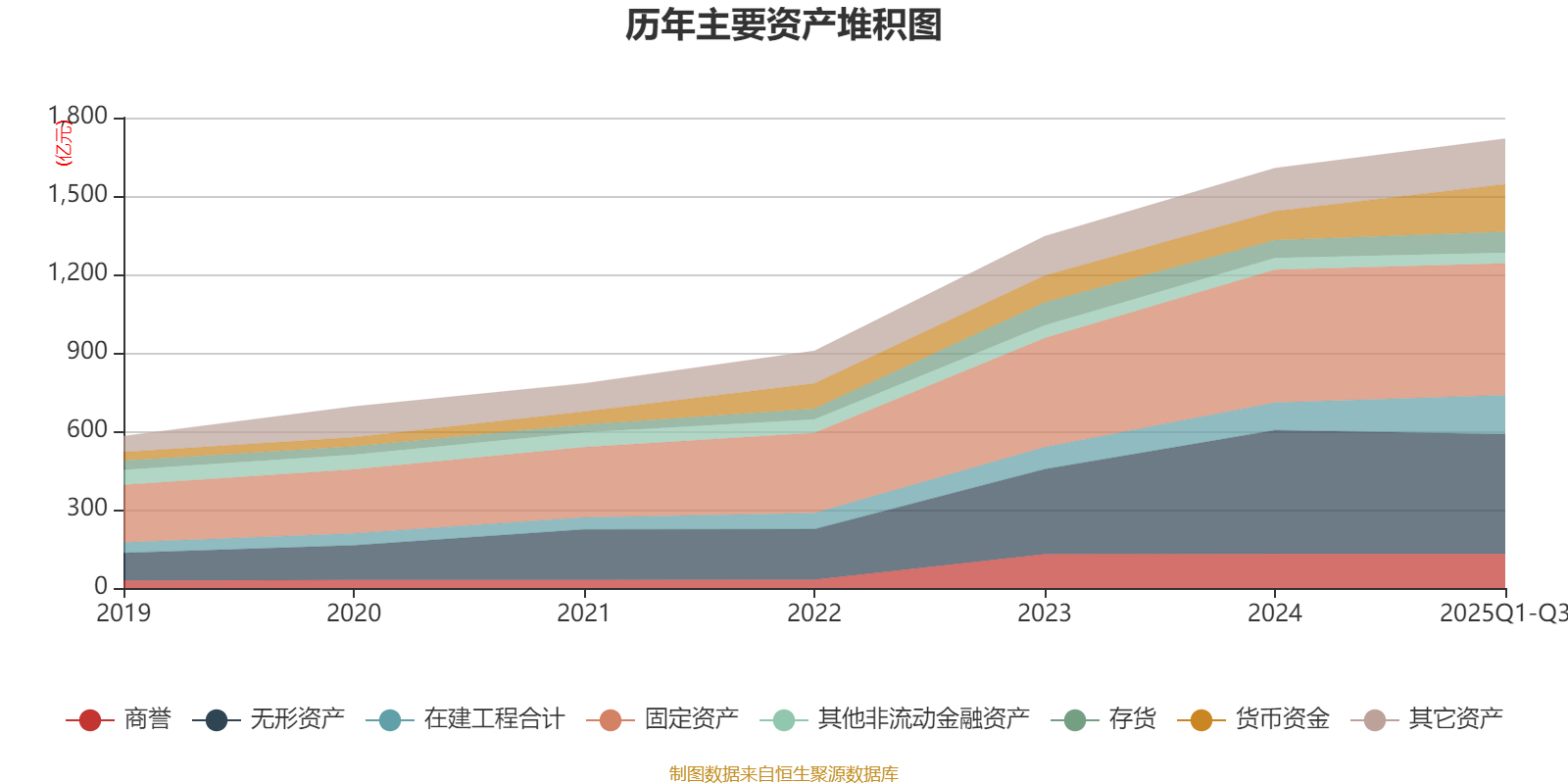 资产重大变化方面,截至2025年三季度末,公司货币资金较上年末增加64.07%,占公司总资产比重上升3.67个百分点;无形资产较上年末减少3.09%,占公司总资产比重下降2.79个百分点;固定资产较上年末减少0.91%,占公司总资产比重下降2.35个百分点;在建工程合计较上年末增加40.66%,占公司总资产比重上升2.07个百分点。