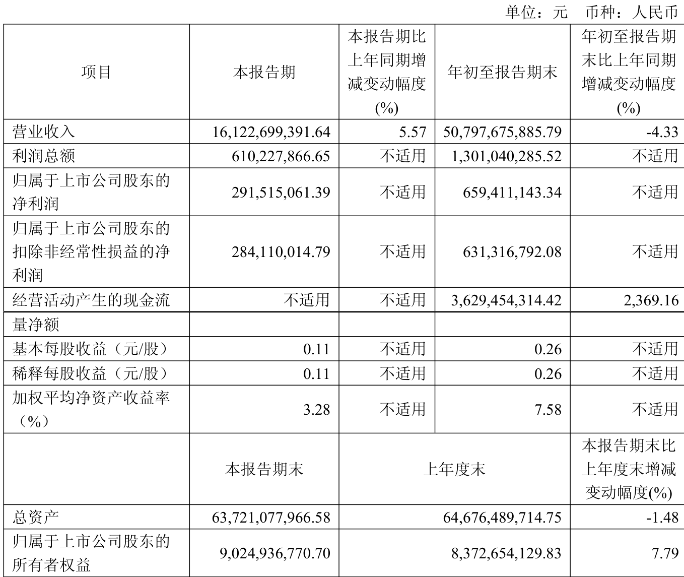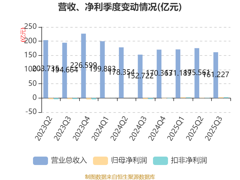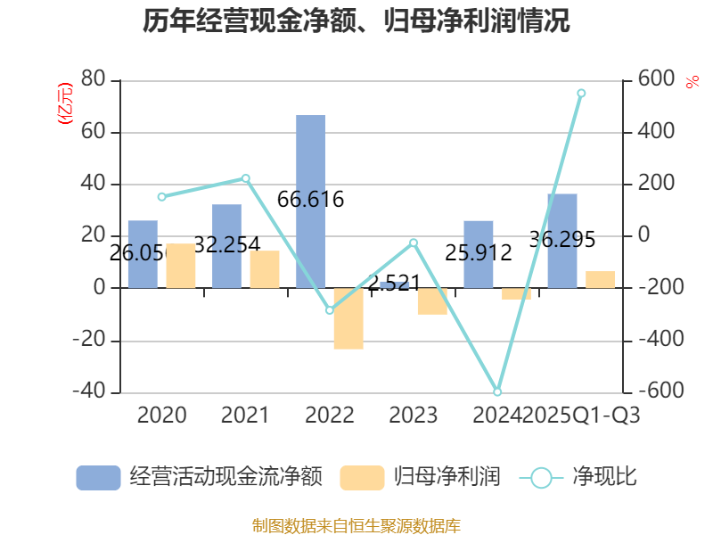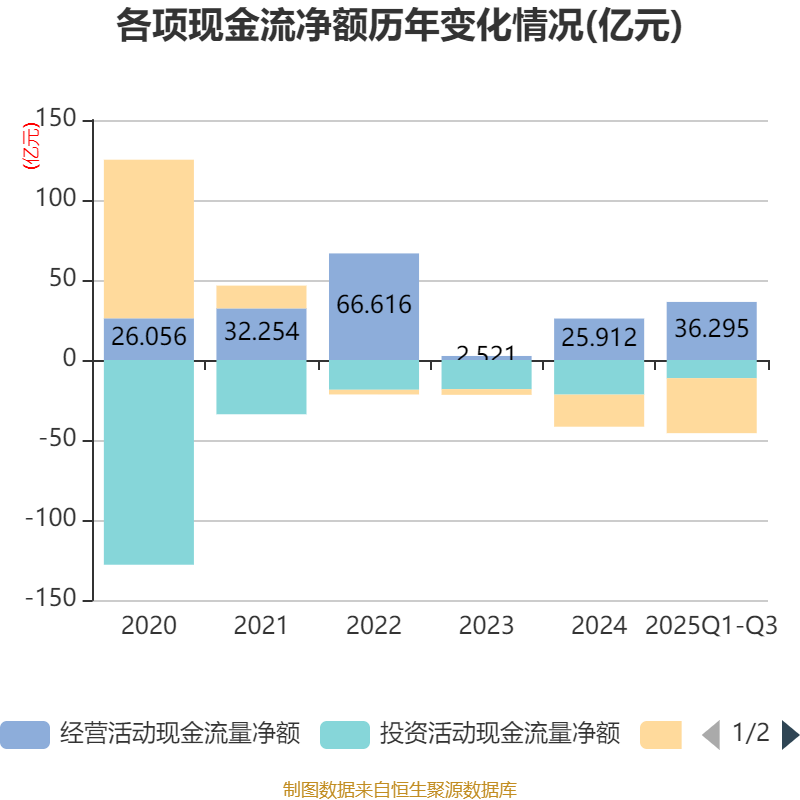 2025年前三季度,公司经营活动现金流净额为36.29亿元,同比增长2369.16%;筹资活动现金流净额-34.38亿元,同比减少21.83亿元;投资活动现金流净额-11.34亿元,上年同期为-16.37亿元。