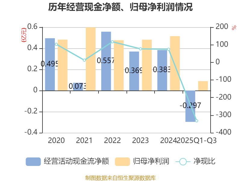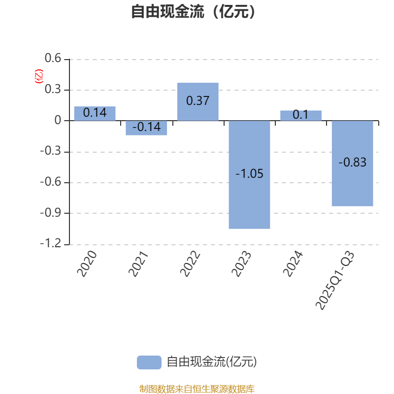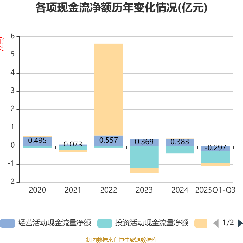 2025年前三季度,公司经营活动现金流净额为-2967.99万元,同比减少2192.34万元;筹资活动现金流净额-2026.16万元,同比减少2700.61万元;投资活动现金流净额-6306.06万元,上年同期为-2880.34万元。