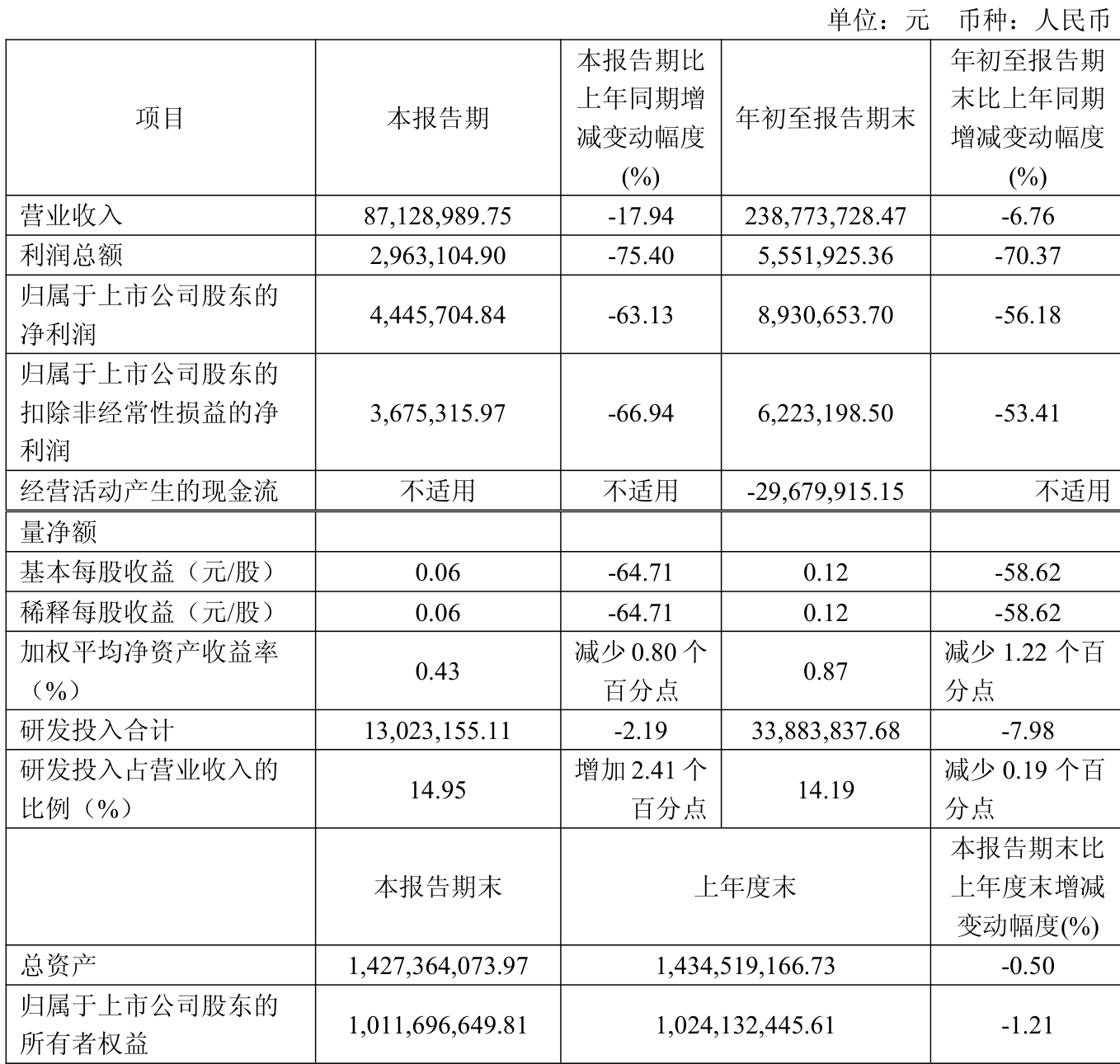 中证智能财讯磁谷科技(688448)10月30日披露2025年第三季度报告。前三季度公司实现营业总收入2.39亿元,同比下降6.76%;归母净利润893.07万元,同比下降56.18%;扣非净利润622.32万元,同比下降53.41%;经营活动产生的现金流量净额为-2967.99万元,上年同期为-775.65万元;报告期内,磁谷科技基本每股收益为0.12元,加权平均净资产收益率为0.87%。
