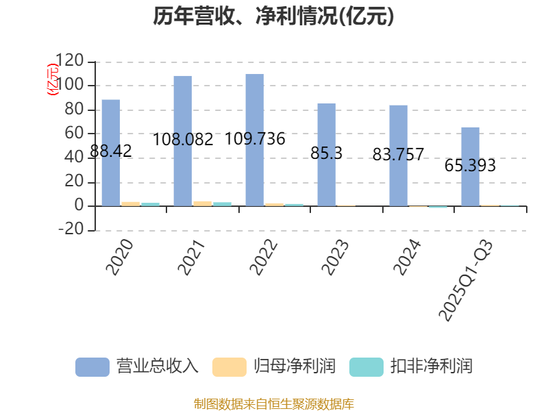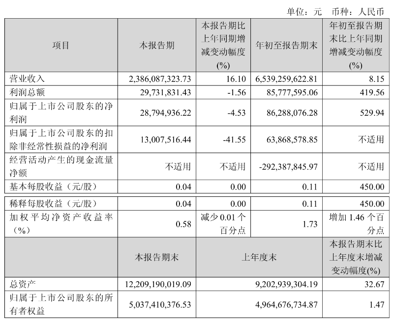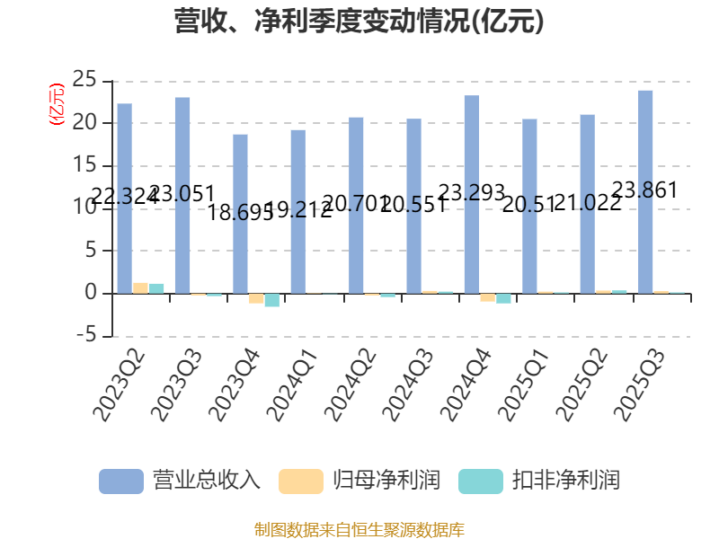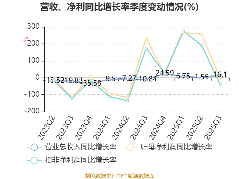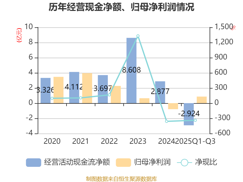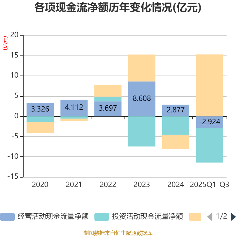 2025年前三季度,公司经营活动现金流净额为-2.92亿元,同比增加1007.61万元;筹资活动现金流净额15.3亿元,同比增加14.6亿元;投资活动现金流净额-8.5亿元,上年同期为-2.04亿元。