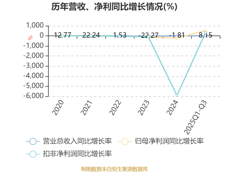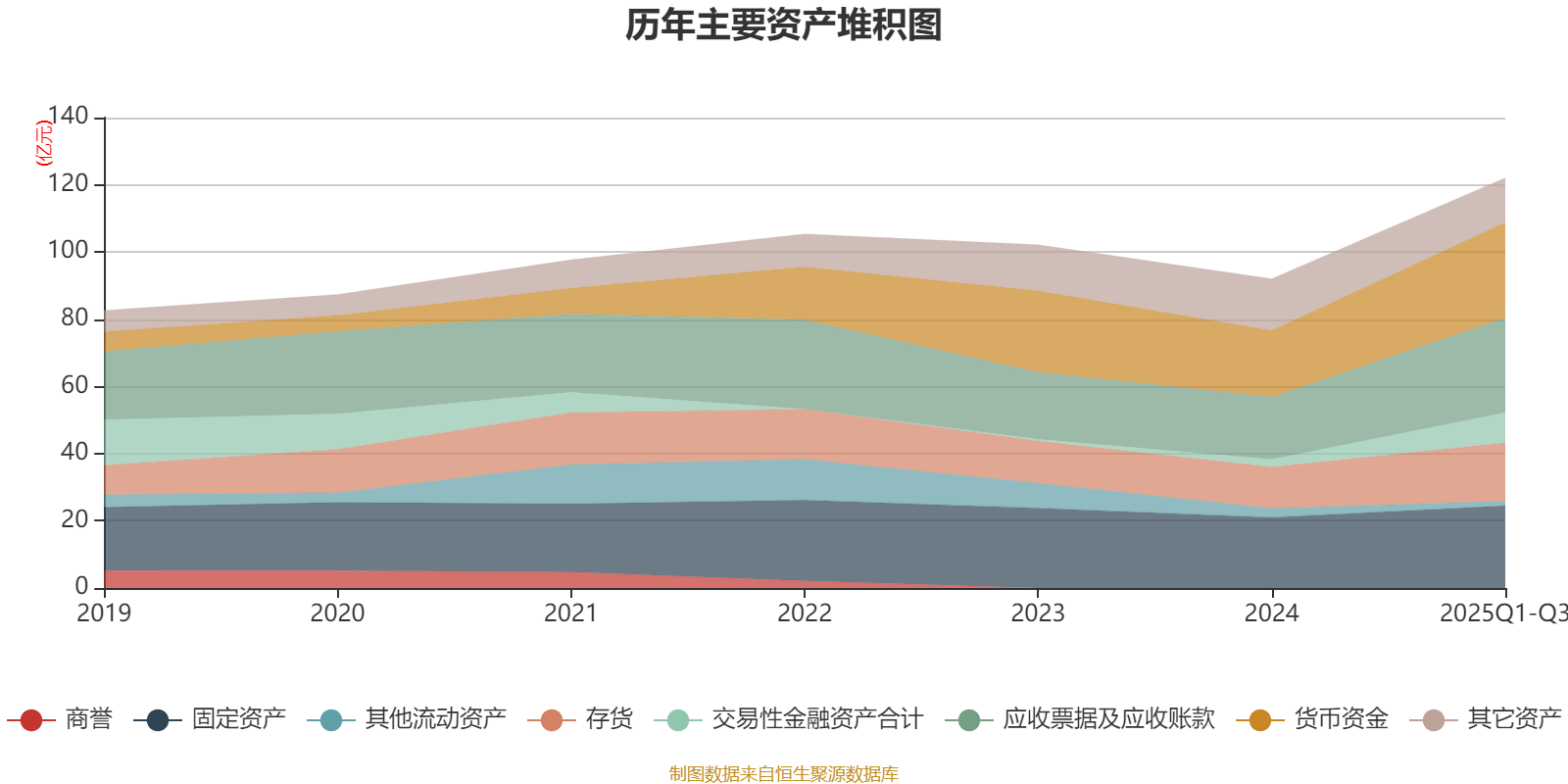 资产重大变化方面,截至2025年三季度末,公司交易性金融资产合计较上年末增加292.05%,占公司总资产比重上升4.88个百分点;在建工程合计较上年末减少96.14%,占公司总资产比重下降3.69个百分点;应收票据及应收账款较上年末增加52.02%,占公司总资产比重上升2.94个百分点;固定资产较上年末增加16.46%,占公司总资产比重下降2.79个百分点。
