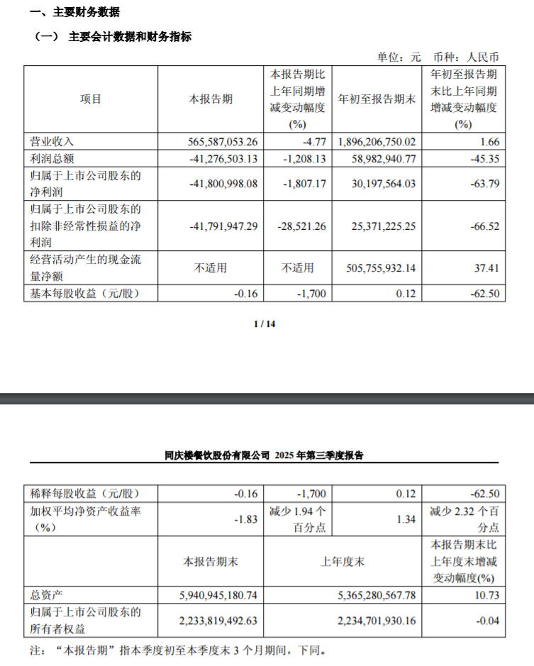 近百年餐饮“老字号”同庆楼10月29日晚间公布的2025年三季报显示,今年前三季度公司实现营业收入19亿元,同比上升1.7%;归属母公司股东的净利润为3020万元,同比大幅下降63.8%;扣非归母净利润为2537万元,同比大降66.5%。