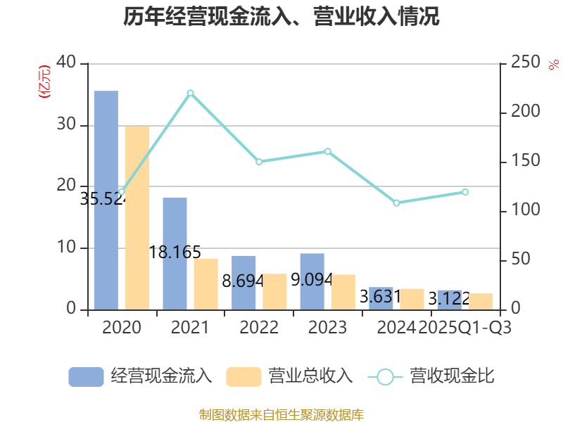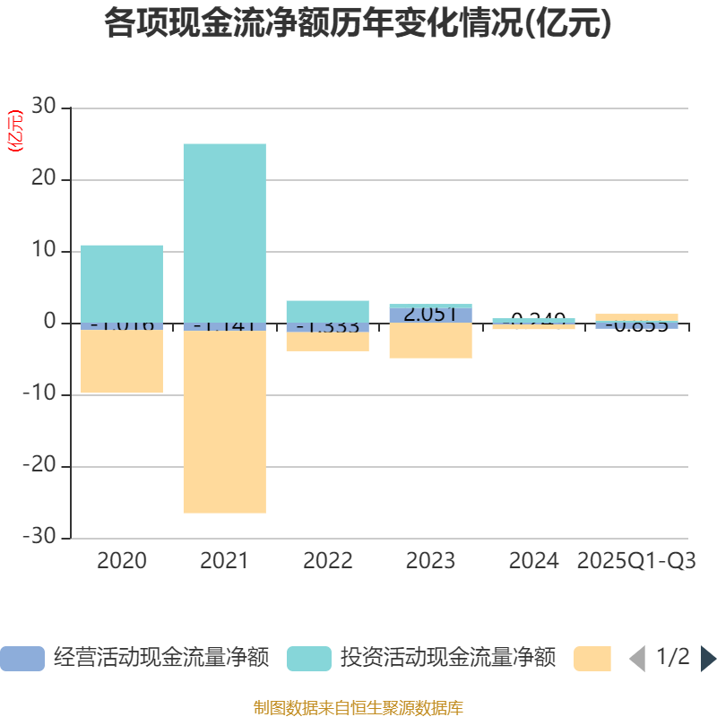 2025年前三季度,公司经营活动现金流净额为-8549.91万元,同比减少5215.62万元;筹资活动现金流净额9618.46万元,同比增加1.56亿元;投资活动现金流净额2781.85万元,上年同期为5702.76万元。