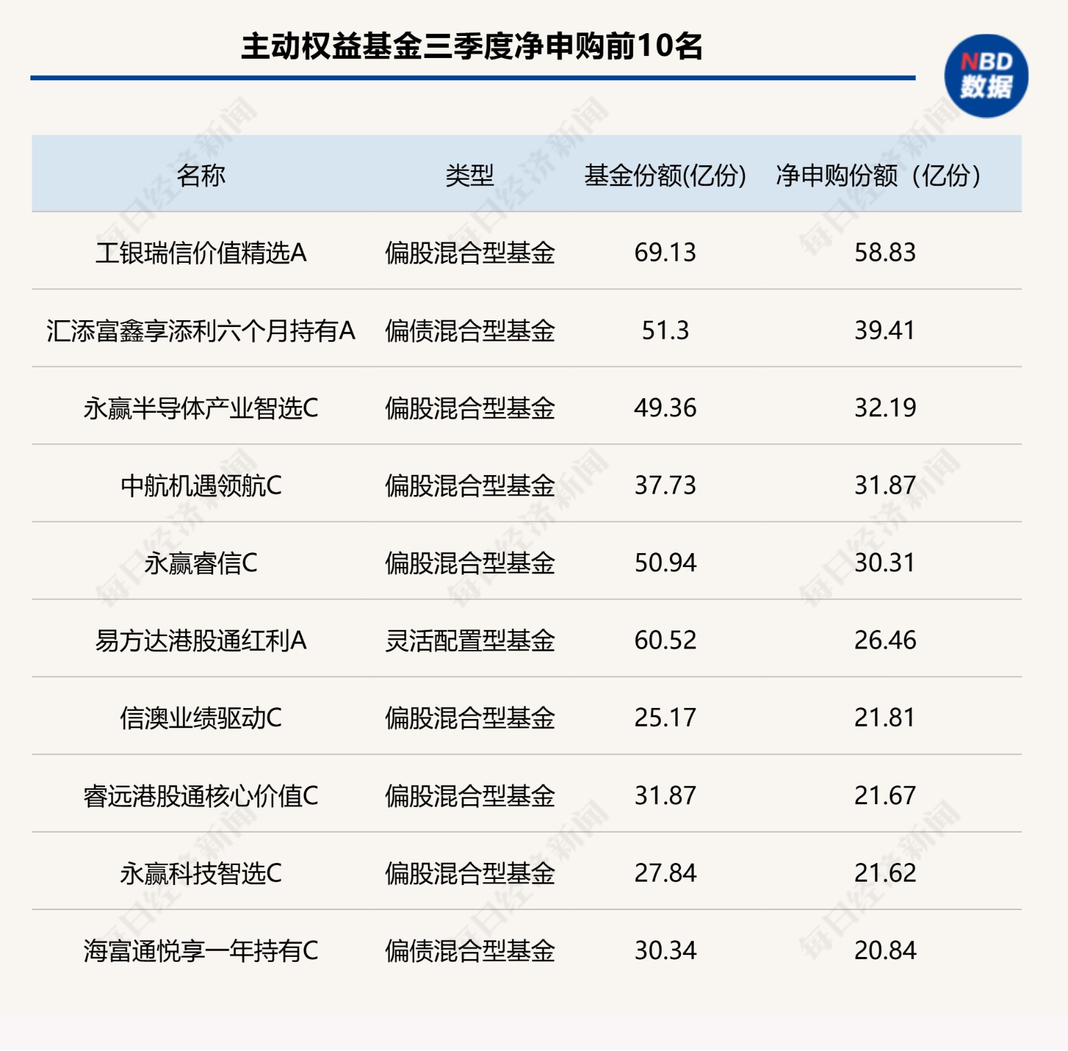 再来看主动权益类基金,随着中国股市进入更为持久的“慢牛”行情,主动产品也出现回暖,三季度全市场共有45只基金获得了超过10亿份净申购。其中工银瑞信旗下的工银价值精选基金A净申购份额居首,达到58.83亿份;其次是汇添富鑫享添利六个月持有A和永赢半导体产业智选C,三季度净申购分别达39.41亿份和32.19亿份。