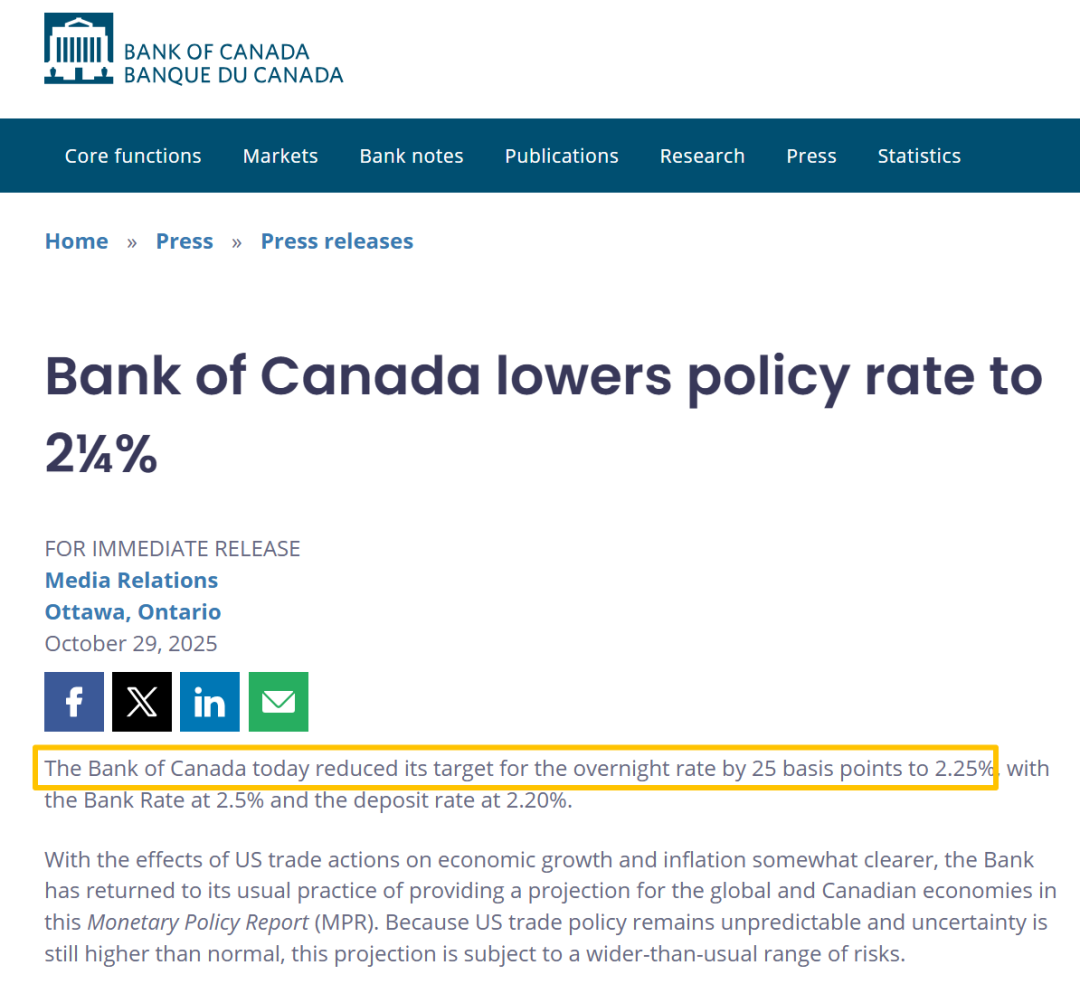 10月29日晚间,加拿大央行(BoC)宣布,将政策利率下调25个基点至2.25%。