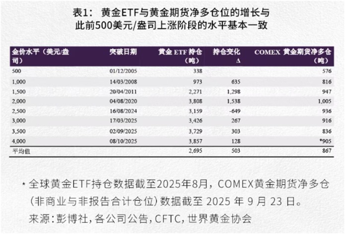 本轮黄金ETF流入始于2024年5月,74周内持仓增加788吨,而黄金期货净多仓仅增116吨。相较于历史均值,当前进程仅完成30%—40%。