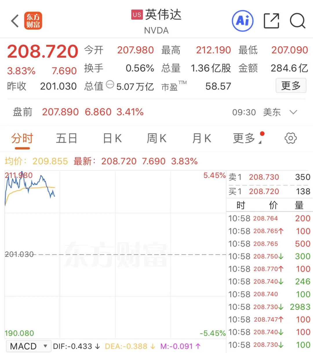 热门个股方面,英伟达早盘大涨,截至发稿,股价涨近4%,总市值5.07万亿美元,成为史上首个市值突破5万亿美元的上市公司。