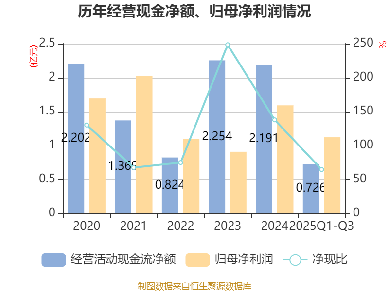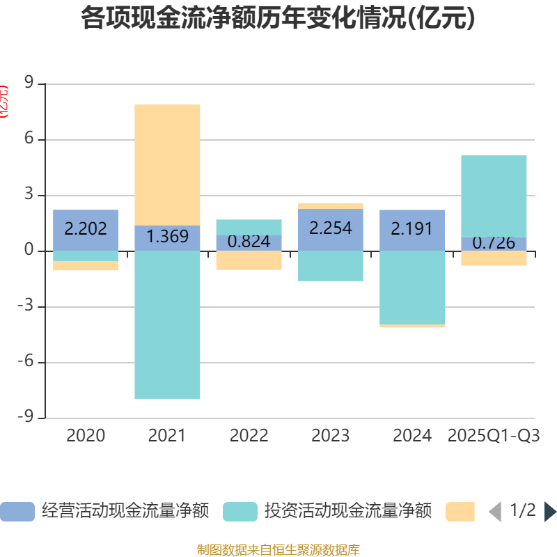 2025年前三季度,公司经营活动现金流净额为7257.32万元,同比下降69.66%;筹资活动现金流净额-8078.5万元,同比减少7803.35万元;投资活动现金流净额4.41亿元,上年同期为-4499.03万元。