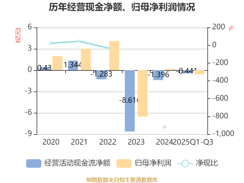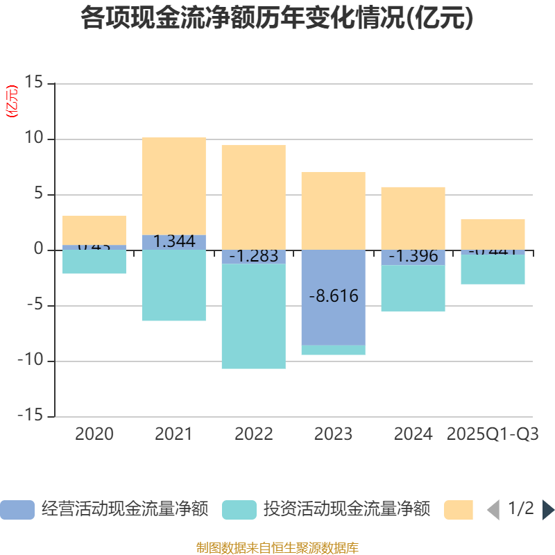 2025年前三季度,公司经营活动现金流净额为-4412.01万元,同比减少1.81亿元;筹资活动现金流净额2.75亿元,同比减少1.54亿元;投资活动现金流净额-2.67亿元,上年同期为-5.38亿元。