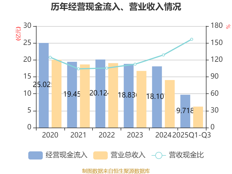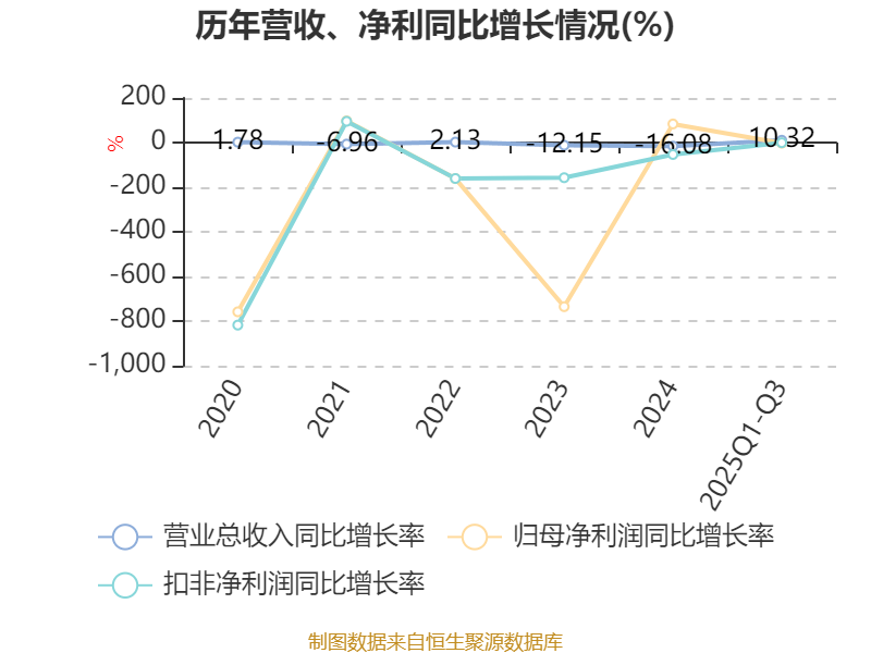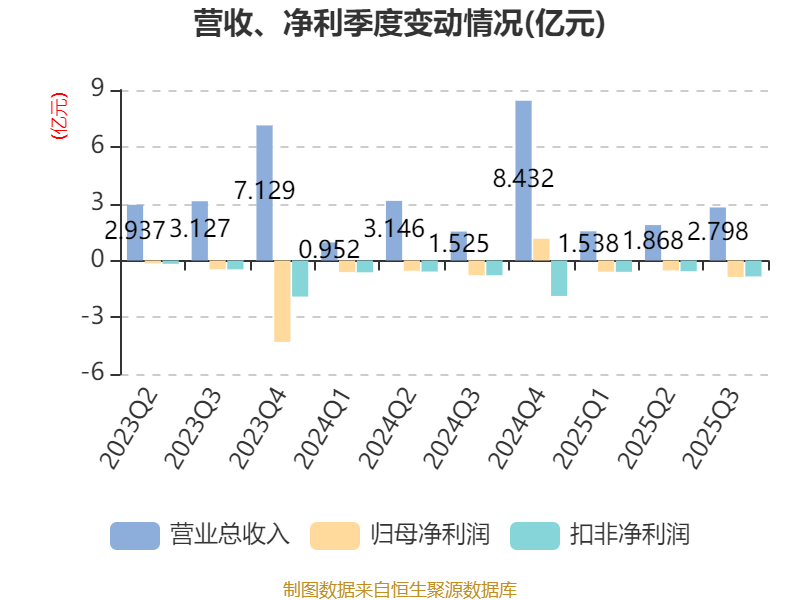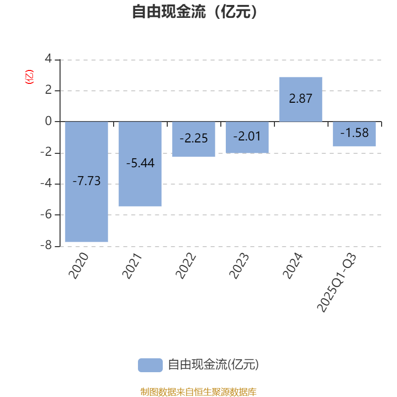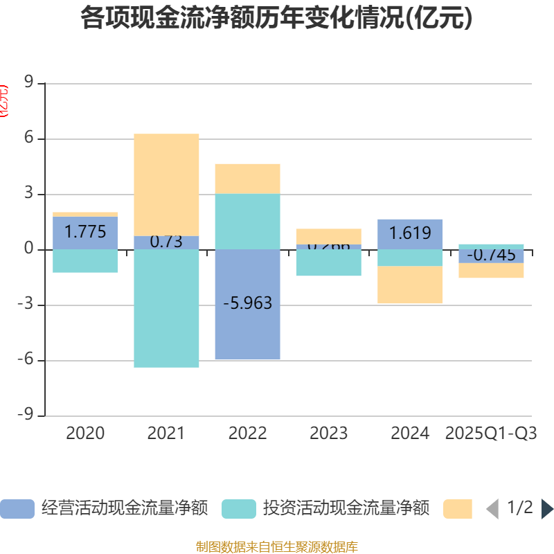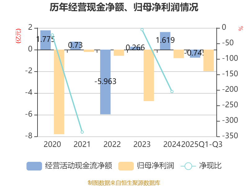 2025年前三季度,公司经营活动现金流净额为-7447.06万元,同比减少2.29亿元;筹资活动现金流净额-7999.94万元,同比增加1.22亿元;投资活动现金流净额2707.62万元,上年同期为-5928.78万元。