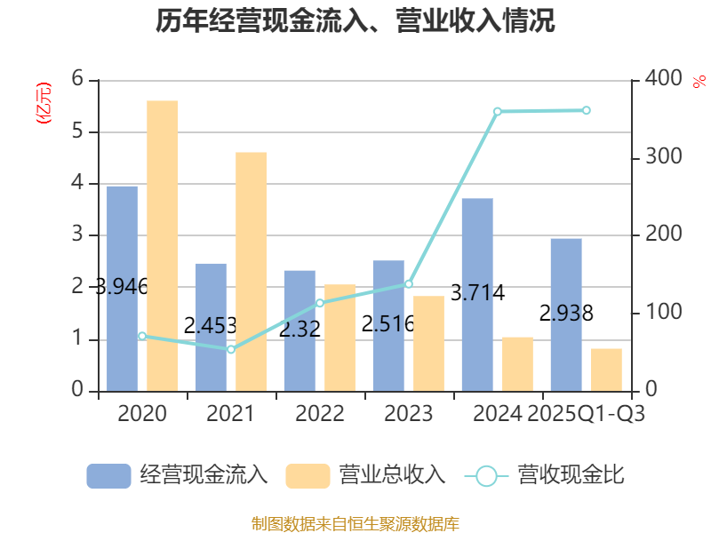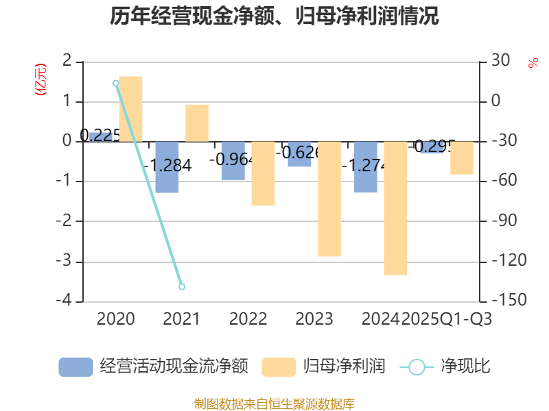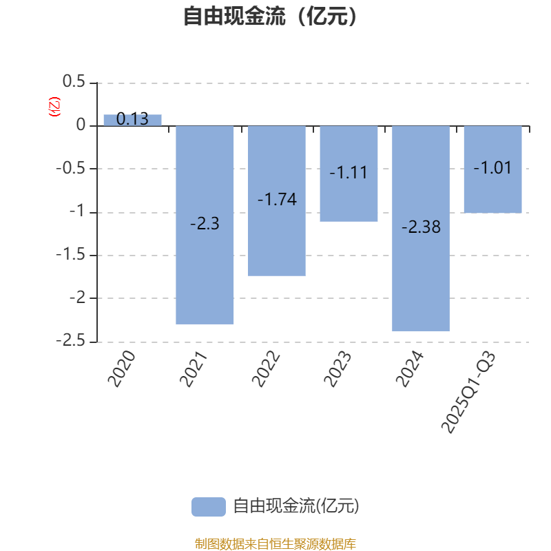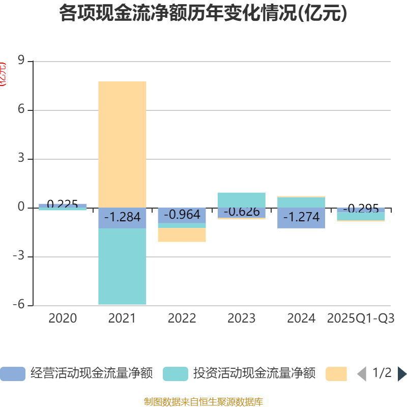 2025年前三季度,公司经营活动现金流净额为-2954.89万元,同比增加6719.78万元;筹资活动现金流净额-720.61万元,同比减少90.42万元;投资活动现金流净额-4869.03万元,上年同期为5963.52万元。