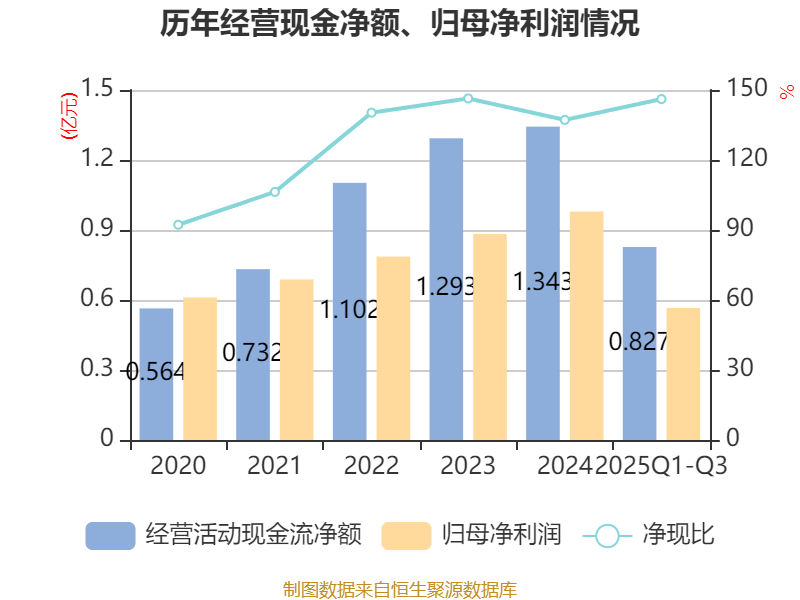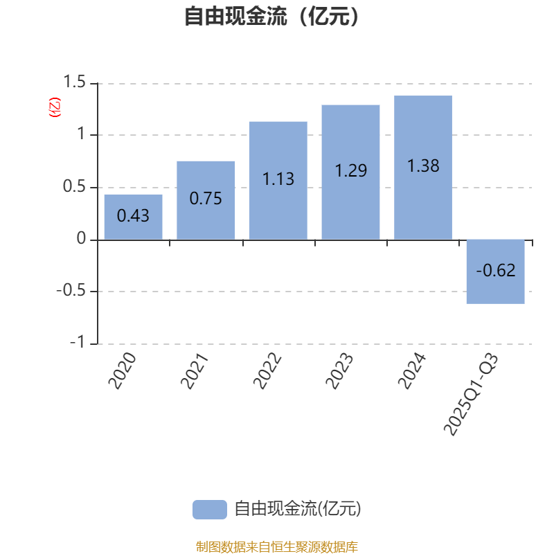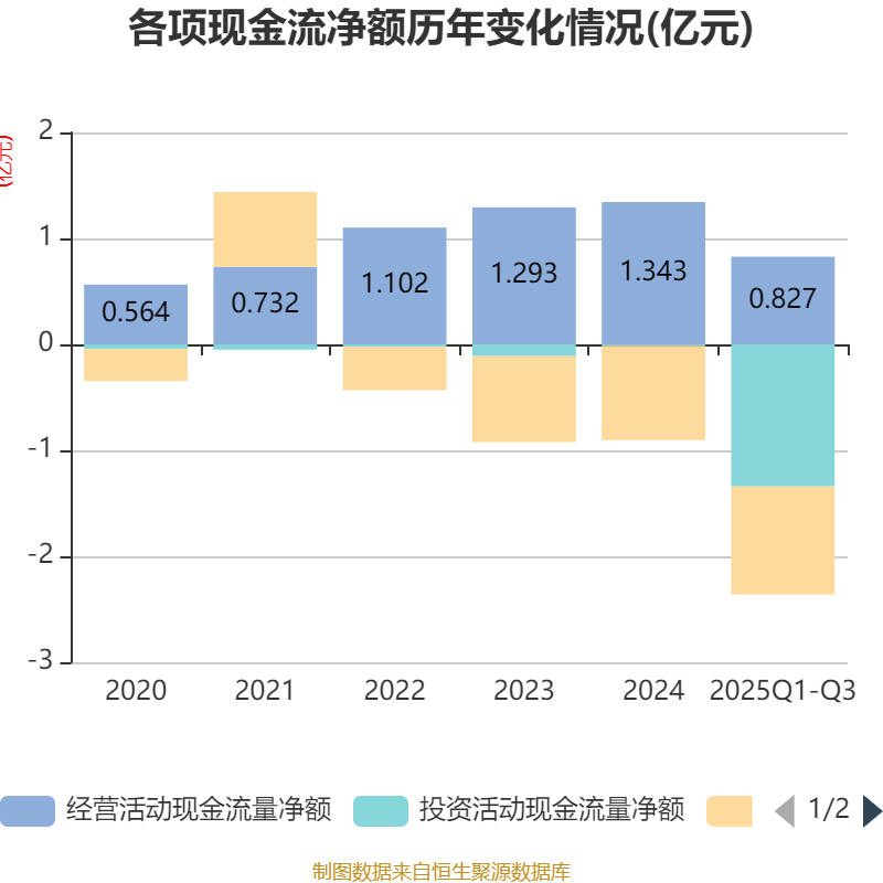 2025年前三季度,公司经营活动现金流净额为8274.91万元,同比增长57.12%;筹资活动现金流净额-1.02亿元,同比减少1590.51万元;投资活动现金流净额-1.34亿元,上年同期为-1.21亿元。