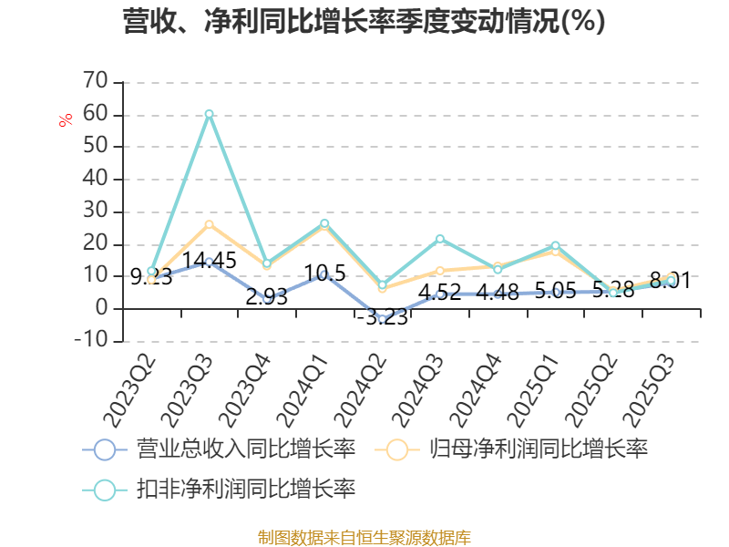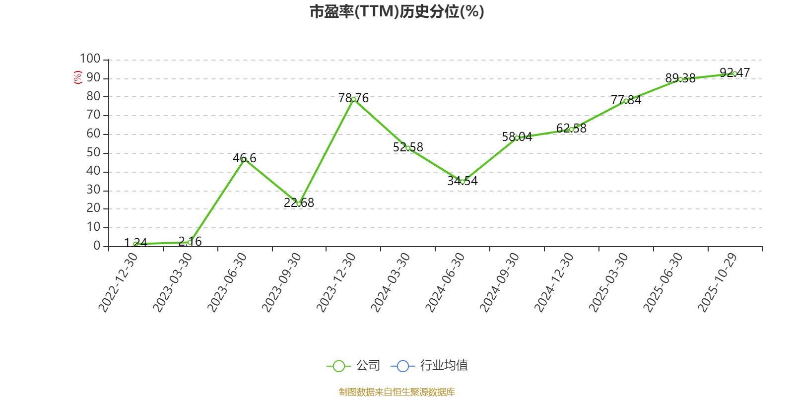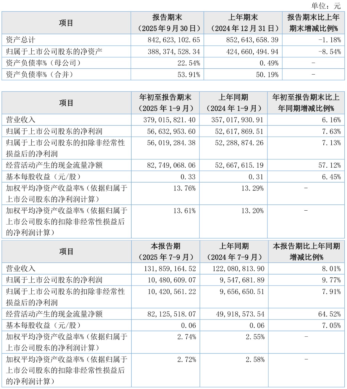 资产重大变化方面,截至2025年三季度末,公司货币资金较上年末减少20.33%,占公司总资产比重下降15.78个百分点;交易性金融资产合计占公司总资产的15.43%,上年末为0;应收票据及应收账款较上年末增加11.41%,占公司总资产比重上升1.04个百分点;其他非流动资产较上年末减少54.5%,占公司总资产比重下降0.85个百分点。