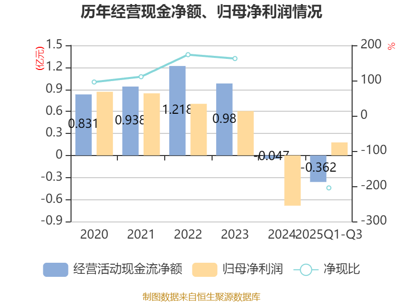 2025年前三季度,公司经营活动现金流净额为-3622.78万元,同比减少5406.23万元;筹资活动现金流净额-5079.52万元,同比增加1.32亿元;投资活动现金流净额675.95万元,上年同期为-6.17亿元。