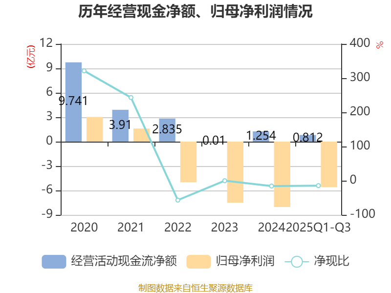 2025年前三季度,公司经营活动现金流净额为8115.57万元,同比增加1.89亿元;筹资活动现金流净额1608.97万元,同比增加1.86亿元;投资活动现金流净额-3.31亿元,上年同期为-6.91亿元。