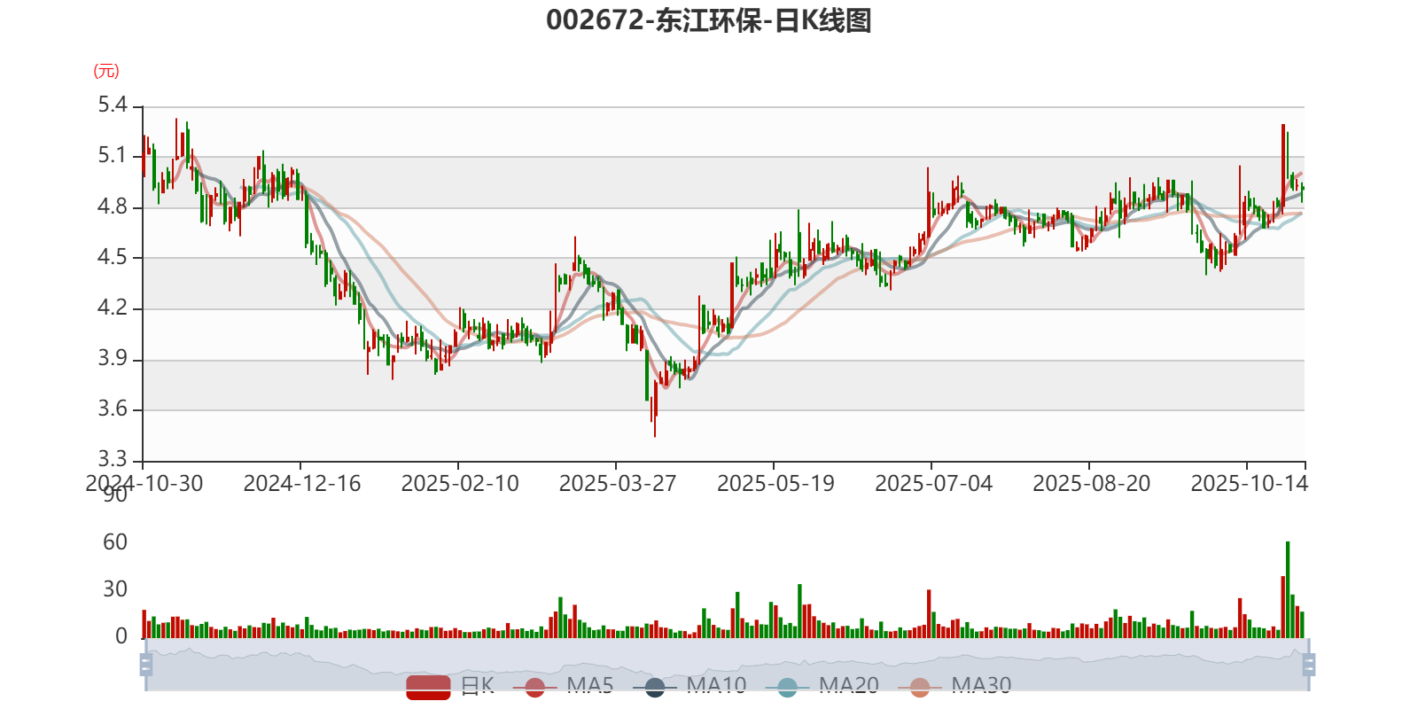 中证智能财讯东江环保(002672)10月30日披露2025年第三季度报告。前三季度公司实现营业总收入24亿元,同比下降2.72%;归母净利润亏损5.6亿元,上年同期亏损3.54亿元;扣非净利润亏损4.83亿元,上年同期亏损3.81亿元;经营活动产生的现金流量净额为8115.57万元,上年同期为-1.08亿元;报告期内,东江环保基本每股收益为-0.51元,加权平均净资产收益率为-16.84%。