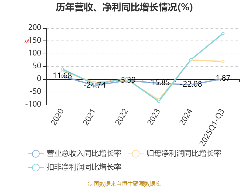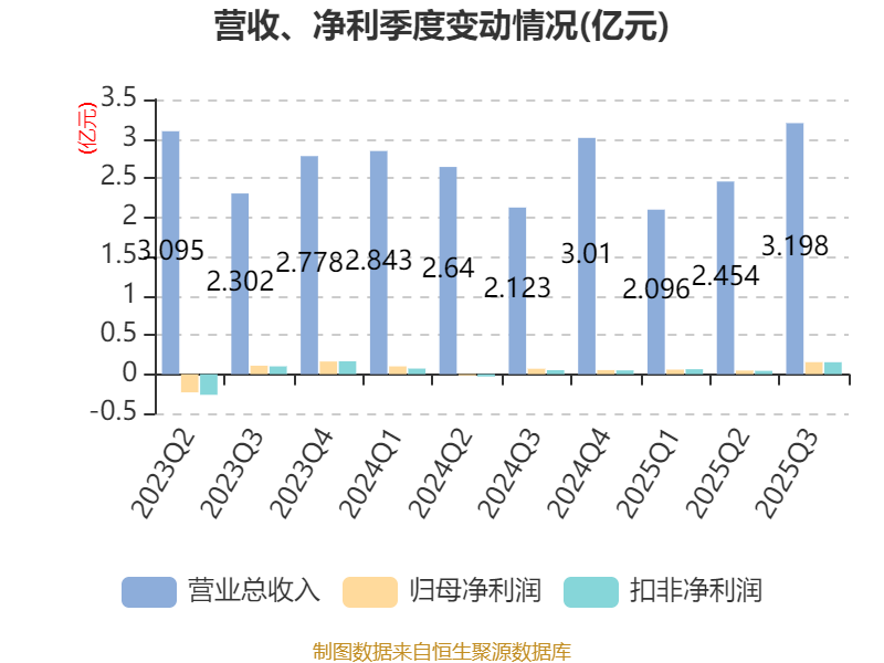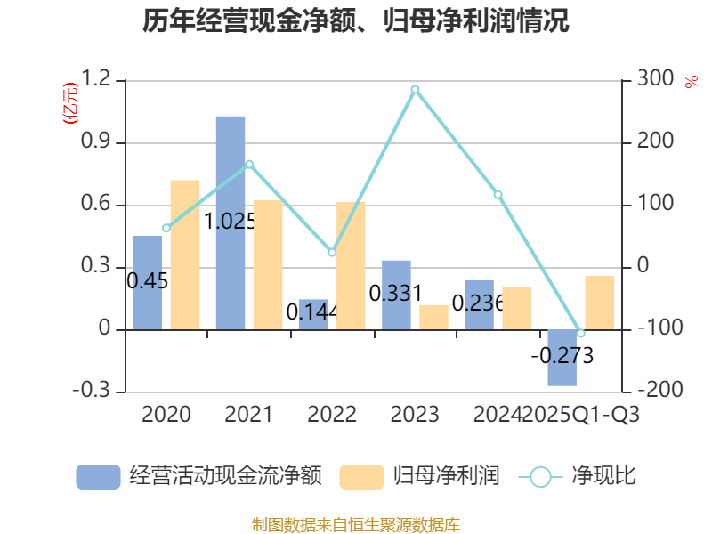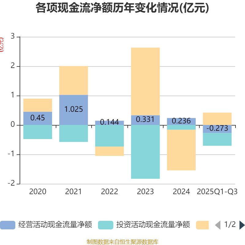 2025年前三季度,公司经营活动现金流净额为-2732.89万元,同比减少6026.95万元;筹资活动现金流净额4204.56万元,同比增加1.65亿元;投资活动现金流净额-4341.56万元,上年同期为-1736.25万元。