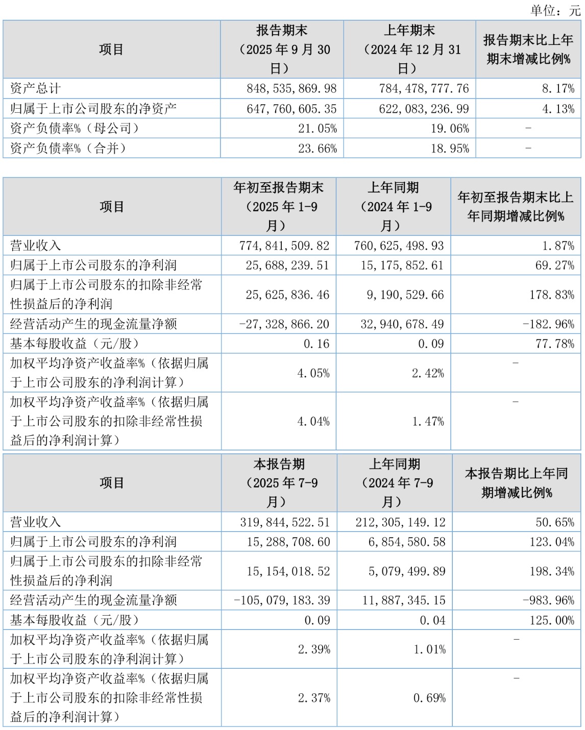 负债重大变化方面,截至2025年三季度末,公司短期借款较上年末增加50.2%,占公司总资产比重上升5.11个百分点;应付票据及应付账款较上年末减少37.88%,占公司总资产比重下降1.88个百分点;合同负债较上年末增加136106.7%,占公司总资产比重上升1.6个百分点;应付职工薪酬较上年末减少20.49%,占公司总资产比重下降0.1个百分点。