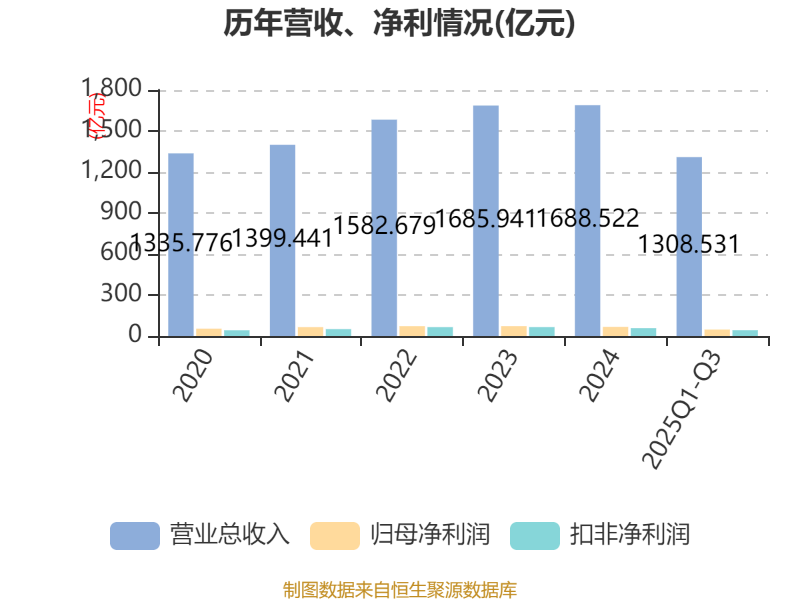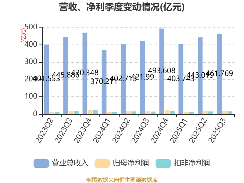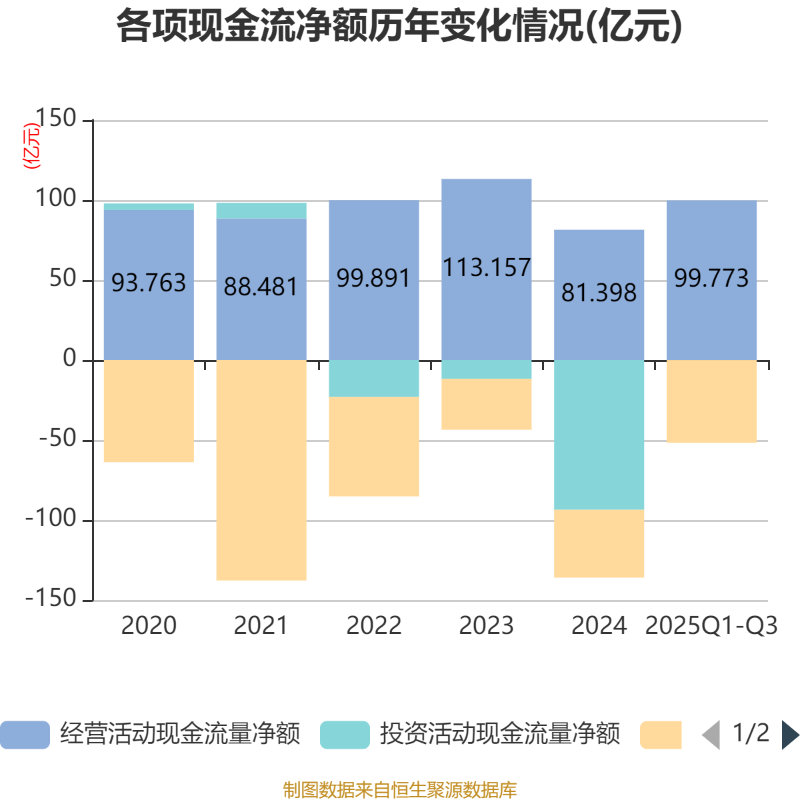 2025年前三季度,公司经营活动现金流净额为99.77亿元,同比增长77.56%;筹资活动现金流净额-51.66亿元,同比减少17.5亿元;投资活动现金流净额-191.8万元,上年同期为-83.67亿元。