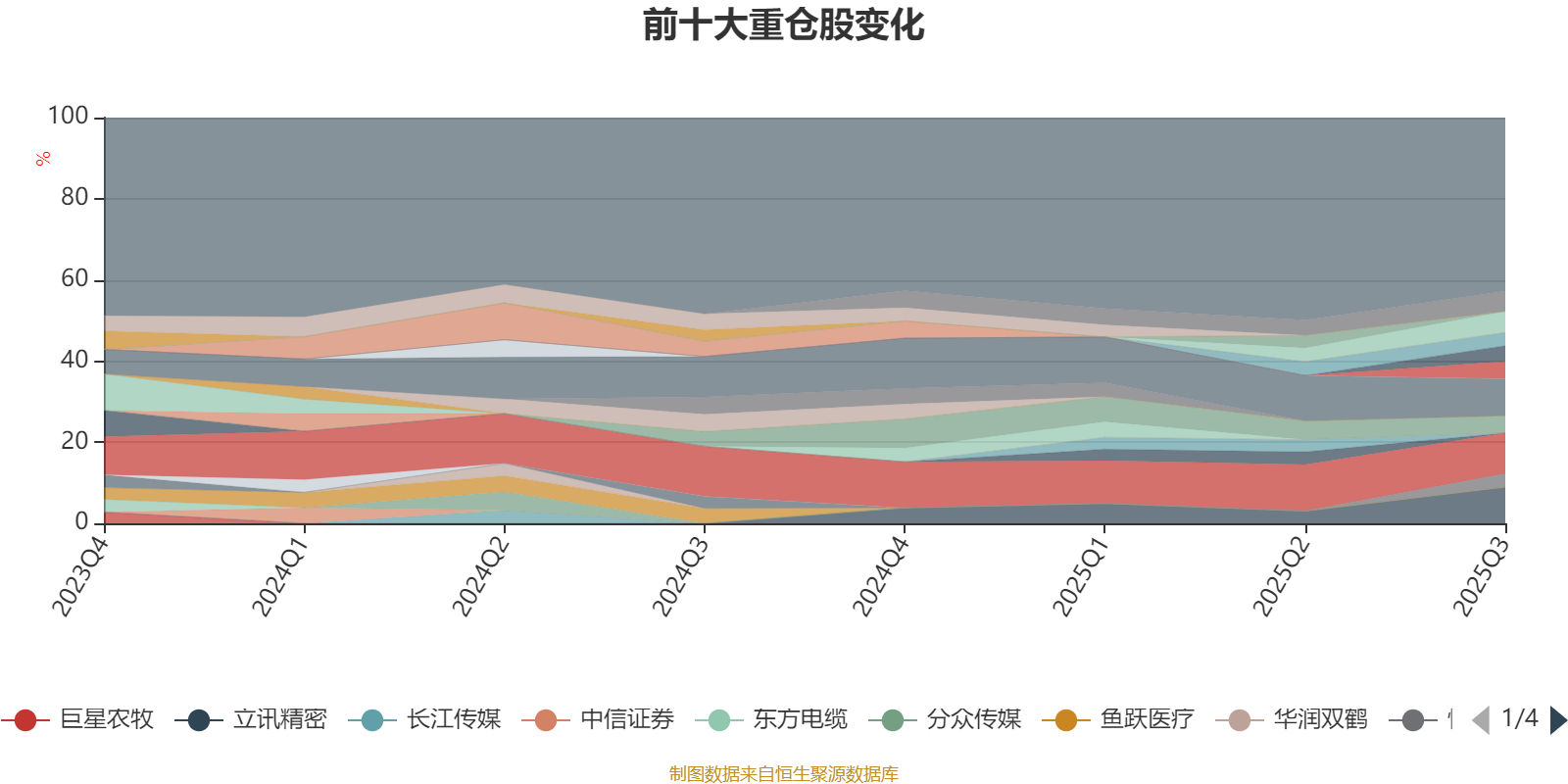 该基金持股集中度较高。截至2025年三季度末,基金十大重仓股分别是宁德时代、成都银行、立讯精密、拓普集团、三环集团、海光信息、保利发展、恒瑞医药、恒立液压、源杰科技。
