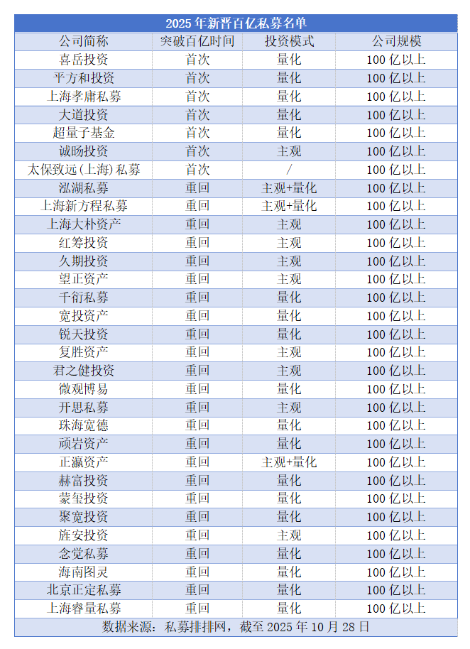 与2024年底相比,31家私募新晋百亿私募,14家私募退出百亿阵营。其中新晋的31家百亿私募中,量化私募有18家,主观私募有9家,主观与量化混合私募有3家,另外有1家暂未披露投资模式。具体来看,喜岳投资、平方和投资、上海孝庸私募、大道投资、超量子基金、诚旸投资和太保致远(上海)私募等7家为首次新晋的百亿私募。此外,泓湖私募、上海新方程私募、上海大朴资产、红筹投资、久期投资、望正资产、千衍私募、宽投资产、锐天投资、复胜资产、君之健投资、微观博易等24家是再次回归百亿阵营的熟面孔。