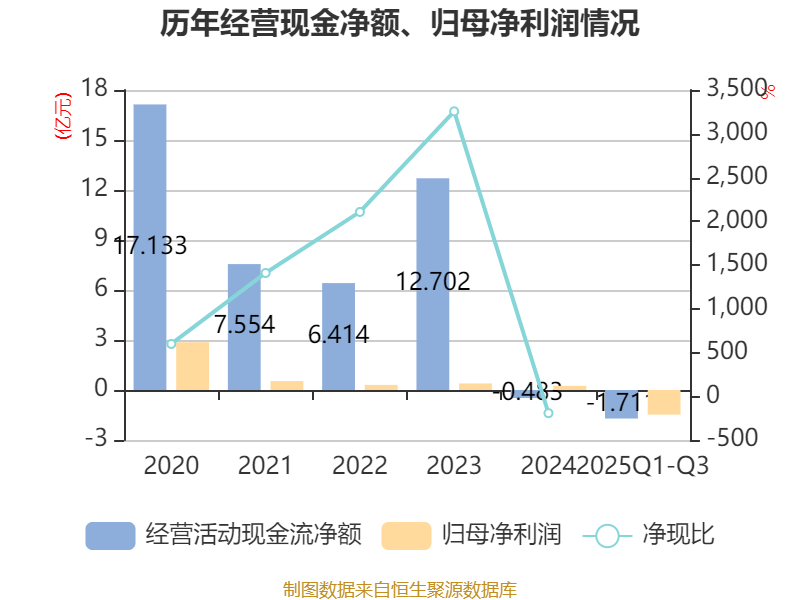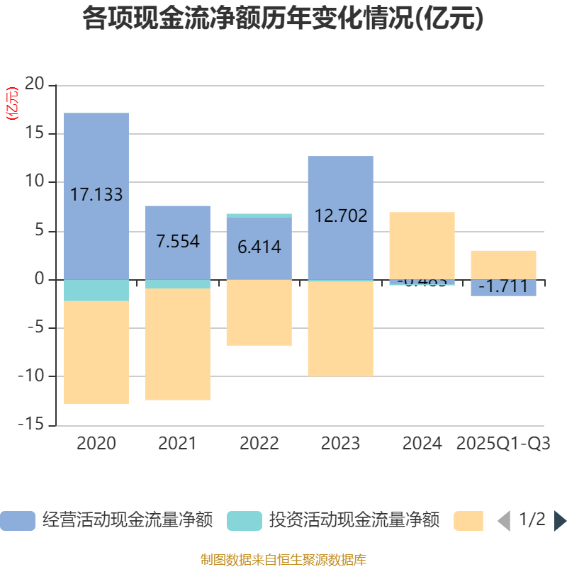 2025年前三季度,公司经营活动现金流净额为-1.71亿元,同比增加2.4亿元;筹资活动现金流净额2.92亿元,同比减少3.28亿元;投资活动现金流净额342.09万元,上年同期为-1213.83万元。