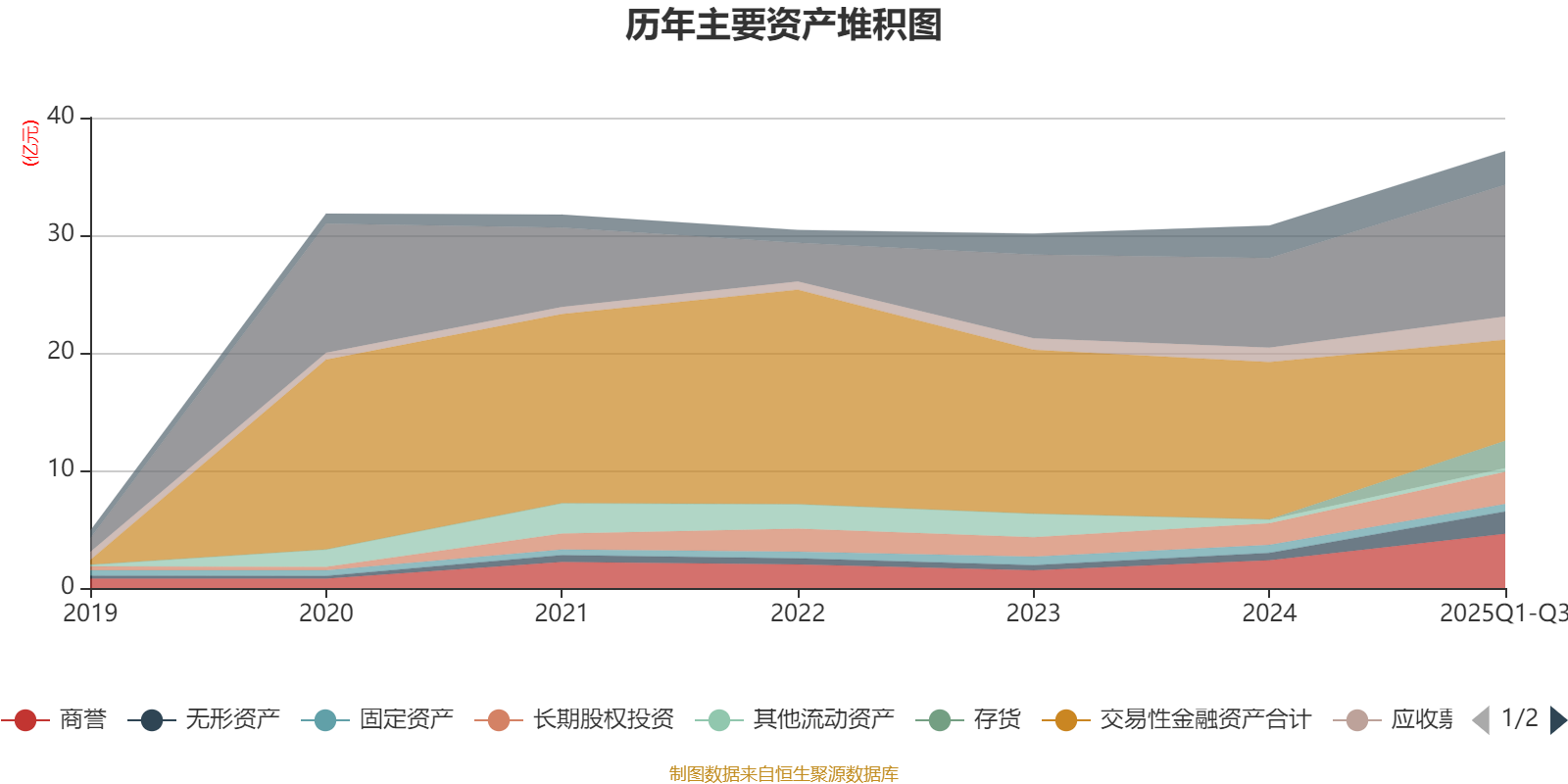 资产重大变化方面,截至2025年三季度末,公司交易性金融资产合计较上年末减少35.79%,占公司总资产比重下降20.31个百分点;存货较上年末增加25697.54%,占公司总资产比重上升6.25个百分点;货币资金较上年末增加46.67%,占公司总资产比重上升5.36个百分点;商誉较上年末增加95.4%,占公司总资产比重上升4.74个百分点。