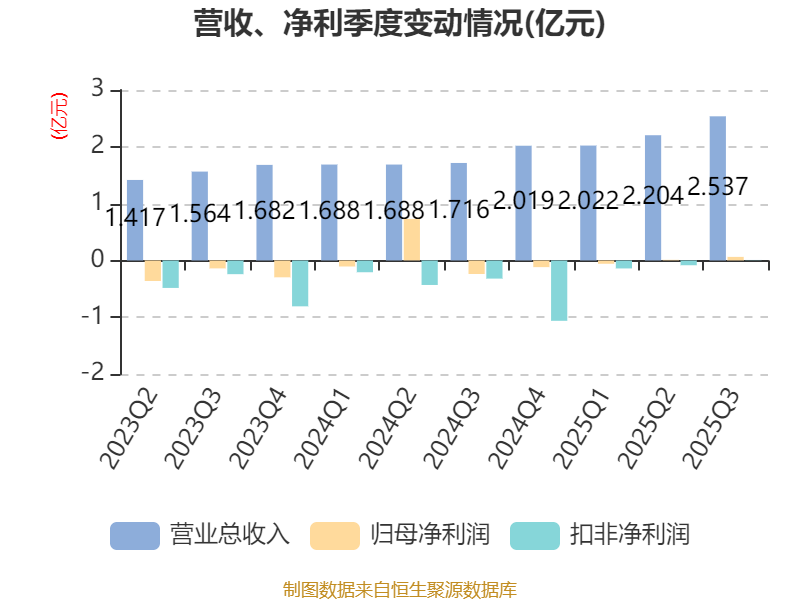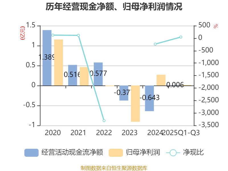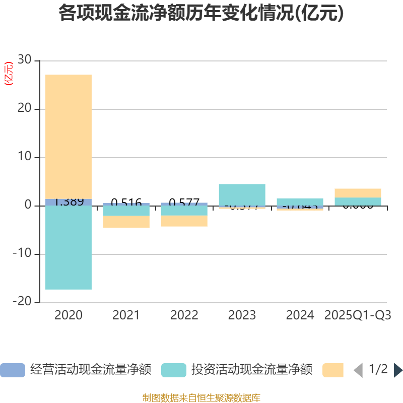 2025年前三季度,公司经营活动现金流净额为60.88万元,同比增加1.06亿元;筹资活动现金流净额1.83亿元,同比增加2.33亿元;投资活动现金流净额1.65亿元,上年同期为1.62亿元。